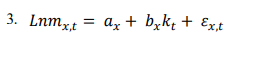 Where Lnmx,t indicates the natural logarithm of death rates observed at age x and in year t, and, ax, bx and kt are age- and time-dependent parameters, respectively. ax, indicates the average time logarithm of death rates at age x, in other words, εx,t illustrates the overall shape of the mortality rate’s curve; kt is the mortality index in year t which indicates the primary trend in the natural logarithm of mortality rates for all ages over time; and bx shows the rate of changes in the mortality rate logarithm at age x to (per) changes in the mortality index over time. Component, εx,t is equal to the component error at age x and time t. According to Equation 3, the following relationship is obtained (Equation 4):