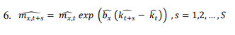 In the second stage of prediction, values for age-specific mortality rates are anticipated. Regardless of the error term, changes in the rate of deaths in a particular year are completely dependent on each other and are linear functions of the time variable parameter of kt. Therefore, to calculate confidence intervals of mortality rates in any age group and in any given year, only kt confidence interval should be calculated. The prediction of mortality rates for the estimated parameter values βx and αx and predicted values kt is calculated according to the Equation 6 [14]: