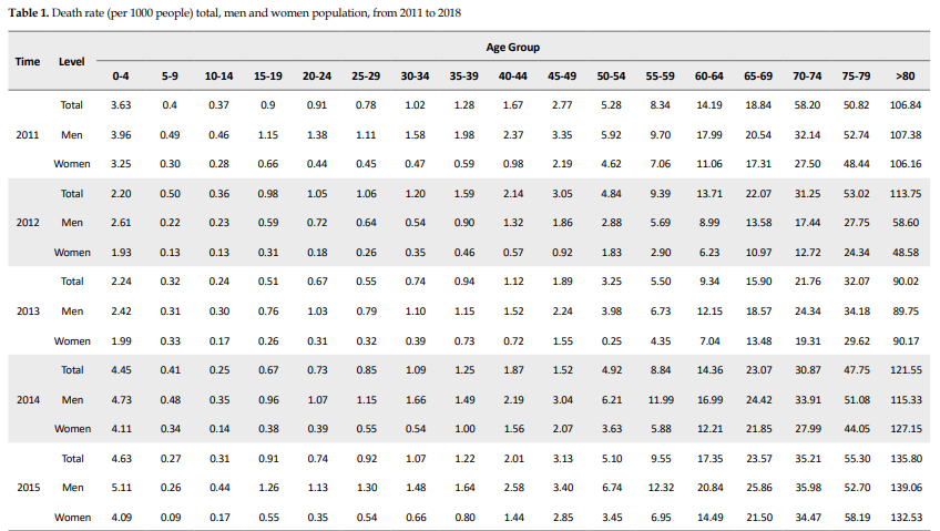 This study was a secondary analysis based on available data. The study population included all deaths registered in the health department of Golestan University of Medical Sciences during 2011-2018. Information about mortality (cause of death, age, and sex) was obtained from the golestan death registry as an Excel file.