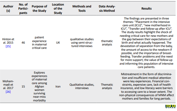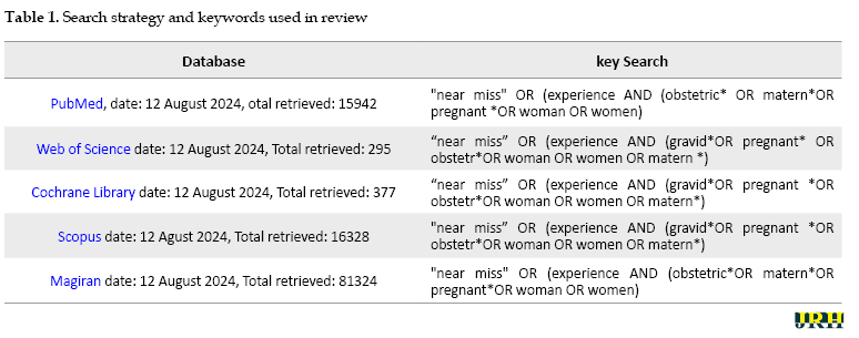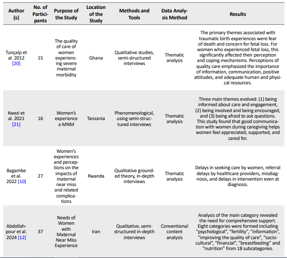 The inclusion criteria included mothers’ near-death experiences, which were mentioned in the title, abstract, or body of the article. Documents requiring full-text review were thoroughly studied. The exclusion criteria included studies on near-loss of an infant, non-Persian or non-English articles, conference abstracts, letters to the editor, case reports, and quantitative studies.