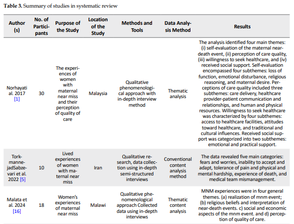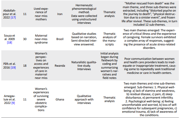 A systematic review of qualitative studies was conducted using the meta-synthesis method. In this study, thematic synthesis techniques were used to analyze the approach. Thematic synthesis is performed in three stages: line-by-line coding of the text, formation of descriptive themes, and production of analytical themes [13]. We included qualitative studies where the focus was on women who experienced a near-miss event. The key search term was “near miss” OR (experience AND (obstetric* OR matern* OR pregnant *OR woman OR women and “qualitative” (