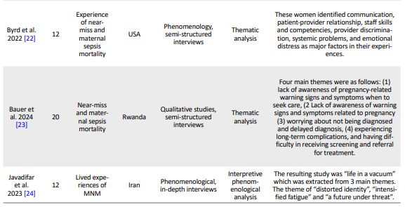The examination of lived experiences among women surviving MNM with significant complications during pregnancy or childbirth is increasingly acknowledged as a critical tool for assessing the quality of maternity care [9]. By exploring MNM experiences, it is possible to formulate patient-centered clinical guidelines, which can optimize service delivery, promote standardization, mitigate unnecessary interventions and associated harm, reduce healthcare expenditures, and ultimately enhance the overall effectiveness of the health system [10]. The occurrence of an MNM event presents a profound stressor for mothers, who often juggle multiple responsibilities as mothers, wives, and family caregivers [11]. From a clinical perspective, MNM cases demand intensive physical care, with a primary emphasis on preserving maternal life. However, this acute focus on physiological stability can result in the inadvertent neglect of patients’ psychological and spiritual well-being [12]. Consequently, mothers may develop severe post-traumatic stress disorder, necessitating specialized mental and emotional support. Moreover, the communication of MNM-related information, which represents ‘bad news,’ can trigger significant distress in patients and their support networks [1]. As noted earlier, healthcare providers may focus on preserving the mother’s life, whereas mothers may experience profound discomfort from residual physical impairments or perceive deficiencies in their treatment. This divergence in perspectives during MNM events reveals a significant gap between mothers’ lived experiences and healthcare professionals. A comprehensive understanding of these experiences is essential to bridge this gap and enhance the quality of care. Since numerous qualitative studies have explored mothers’ experiences of near-death events, a qualitative review methodology is well-suited to integrate and synthesize these findings. Therefore, this study aimed to investigate the lived experiences of mothers with MNM events using a metasynthesis of qualitative studies.