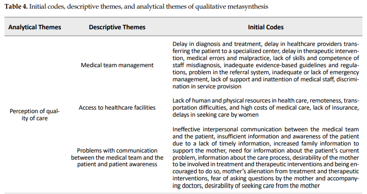 According to the available documents, the experiences of MNM showed factors, such as delay in diagnosis and implementation of treatment, delay of healthcare providers in transferring the patient to a specialized center, delay in therapeutic intervention, errors and medical malpractice, lack of skill and competence of staff, misdiagnosis, inadequacy of guidelines based on the evidence and protocols, problem in the referral system, inadequacy or lack of emergency management, lack of support and carelessness of the treatment staff [5, 10, 18, 25], discrimination in the provision of services, and the mismanagement of the medical team [26].