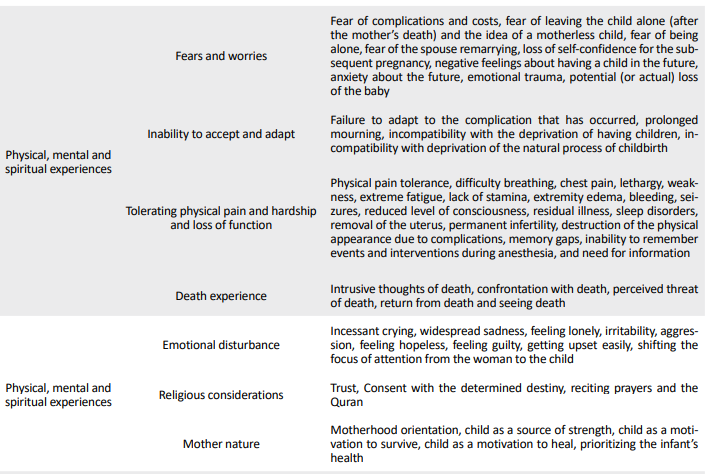 The codes obtained from the documentation of mothers’ experiences regarding the tolerance of pain and physical difficulty and loss of function, pointed out to tolerated physical pain, difficult breathing, chest pain, lethargy, weakness, extreme fatigue, lack of energy, limb edema, bleeding, convulsions, reduced level of consciousness, residual disease, sleep disorder, removal of the uterus, permanent infertility, destruction of the physical body due to complications, memory gap, and failure to remember events and interventions during unconsciousness and the need for information [1, 5, 18].