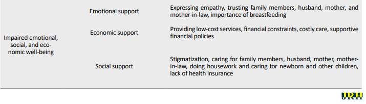 Mothers need family support included not stigmatizing, taking care of family members, husband, mother, mother-in-law in doing housework and taking care of baby and other children. Also, they need social and insurance support due to the lack of health insurance [1, 5, 18-20].