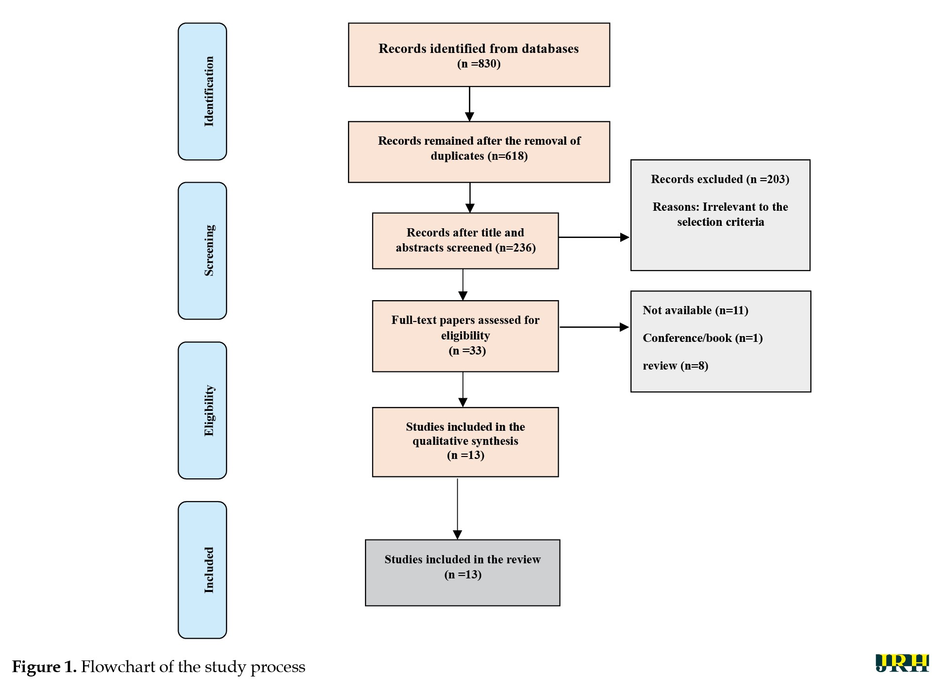 A total of 830 articles were retrieved from three databases. After removing duplicate articles (212 cases) and reviewing the titles and abstracts of the primary articles identified, 33 articles were selected for the final review. After applying the inclusion and exclusion criteria of the study, 13 articles were considered for data extraction. The details of the articles are presented in