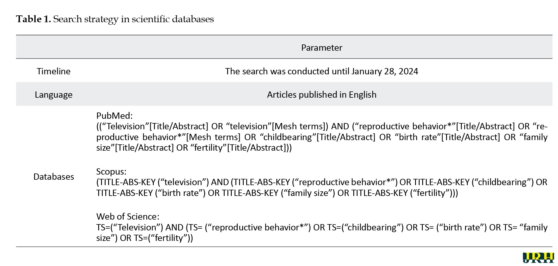 This scoping review, conducted in 2024, investigated the role of television programs in encouraging families to have children. A systematic search strategy was designed using previous studies and authors’ opinions by combining two groups of keywords related to the research topic, including keywords describing television and keywords describing childbearing for each database, and then searching the databases. PubMed, Scopus, and Web of Science were searched until January 28, 2024. The keywords used to search for articles are listed in
