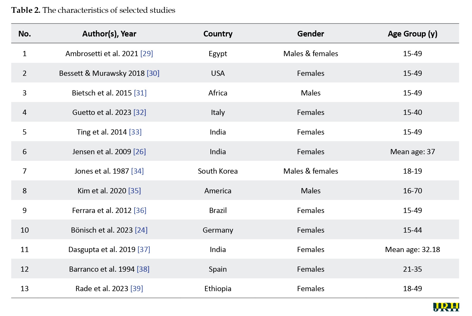 Table 2. Geographically, most studies were conducted in India (23%) and the United States (15%), respectively. Other studies were conducted in Egypt, Africa, Italy, South Korea, Brazil, Germany, Spain, and Ethiopia, each with 7.7%.