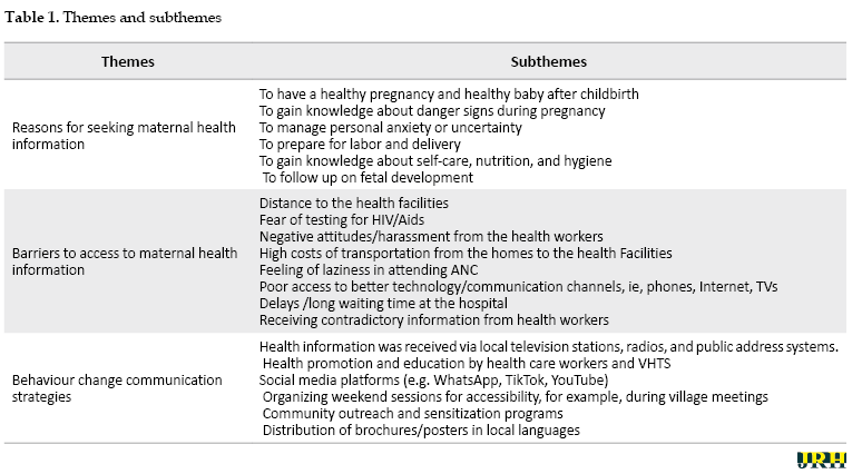 Three themes were identified from the analyzed data. These include reasons for seeking information on maternal healthcare services, challenges faced in seeking such information, and behavioral change communication strategies (Table 1).