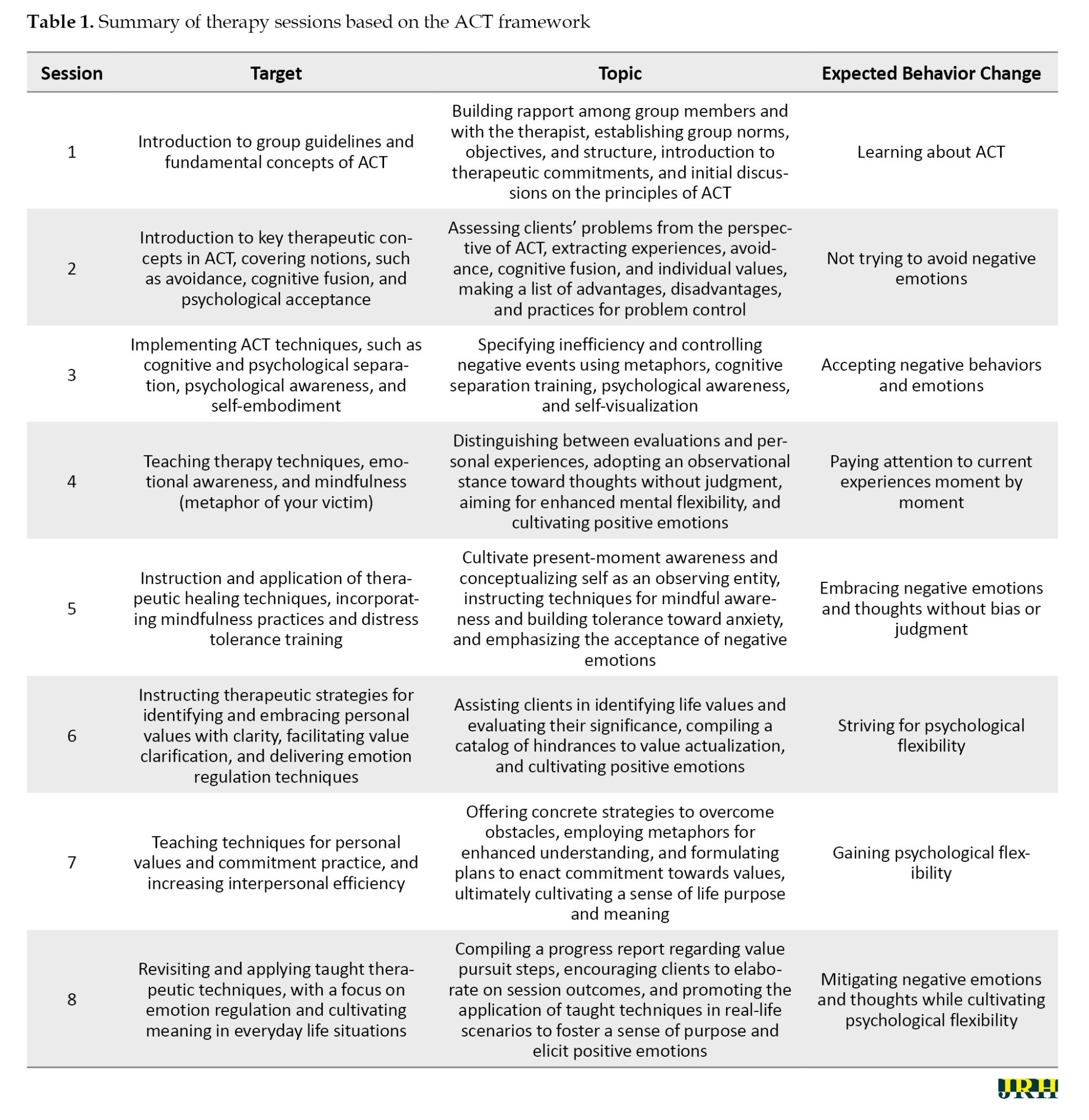 ACT sessions by a therapist in the psychology clinic were then performed in eight 90-minute weekly group sessions for the experimental group, while the control group did not receive any intervention. ACT was designed based on the ACT programs proposed by Hayes et al. [43] and also taking into account the key characteristics in the design of ACT programs (