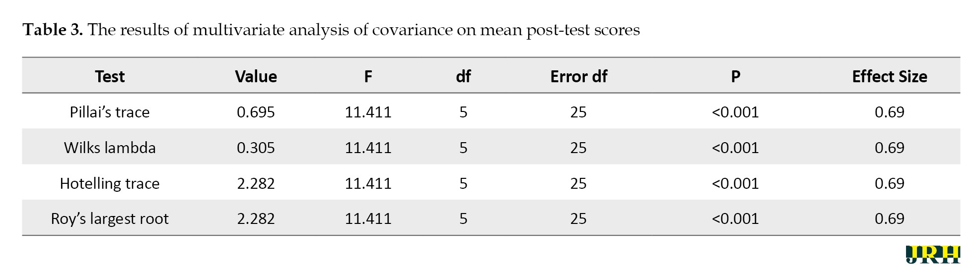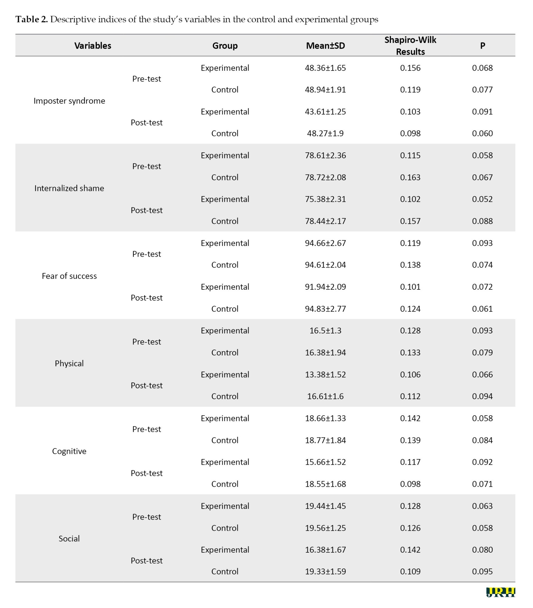 To analyze the research data, descriptive statistics (Mean±SD) and covariance analysis were used based on their assumptions using SPSS software, version 27. The significance level of these tests was considered 0.05. The Shapiro-Wilk test checked the normality of the distribution of variables in the two groups, and its result was not significant for all variables. Therefore, it can be concluded that the distribution of variables was normal (P>0.05).