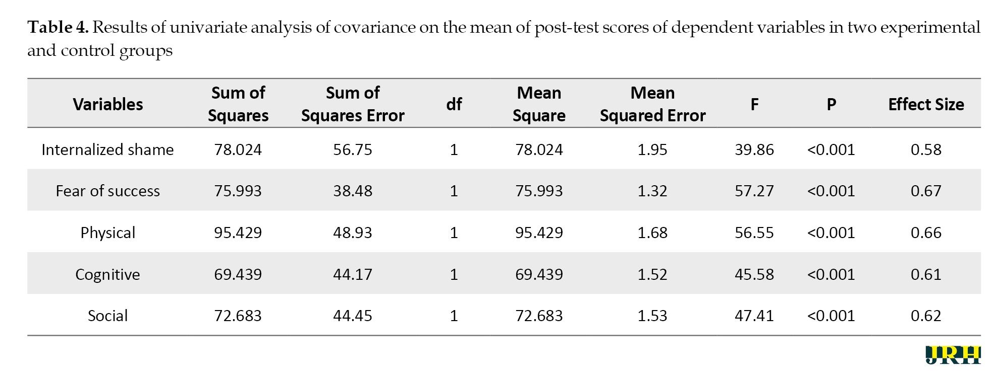 The chi-square Bartlett test, used to evaluate sphericity or the significance of relationships among internalized shame, fear of success, and anxiety sensitivity, revealed a significant relationship between the variables (χ2=124.77, df=14, P<0.01). Another critical assumption for conducting MANCOVA is the homogeneity of regression slopes. This was assessed by examining the interaction between the dependent variables and the independent variable (intervention method) across pre-test and post-test scores. The interaction results indicated that the regression slopes were homogeneous, as these interactions were not significant. Therefore, this assumption was also satisfied. Since all necessary assumptions for conducting MANCOVA were met, the test was deemed appropriate. Subsequently, MANCOVA was performed to identify the differences between the experimental and control groups, as summarized in