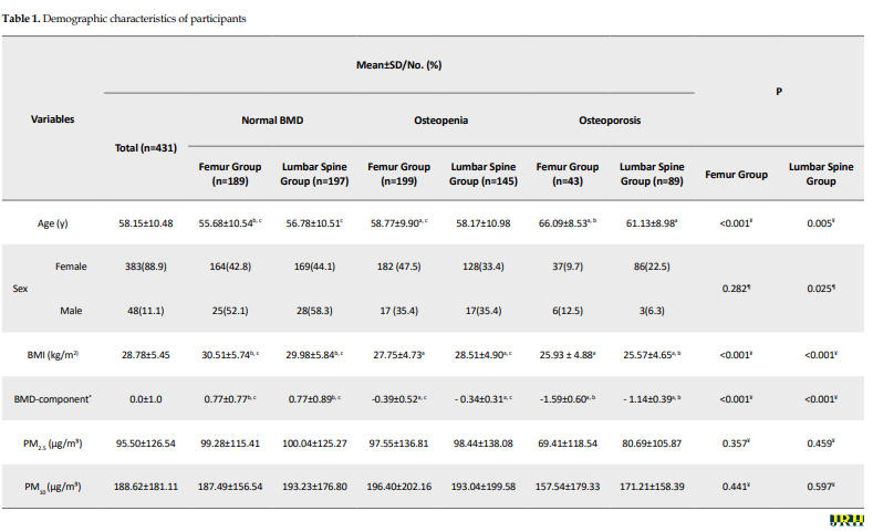 The mean total BMI in the study participants was 28.78±5.45, higher than normal in all three groups (with osteopenia, osteoporosis, and normal BMD). The mean concentrations of PM2.5 and PM10 on the days of admission of the study participants were 95.51±126.05 and 188.62±181.11, respectively (Table 1), which is in the unhealthy air range according to the air quality index (AQI).