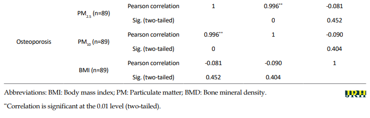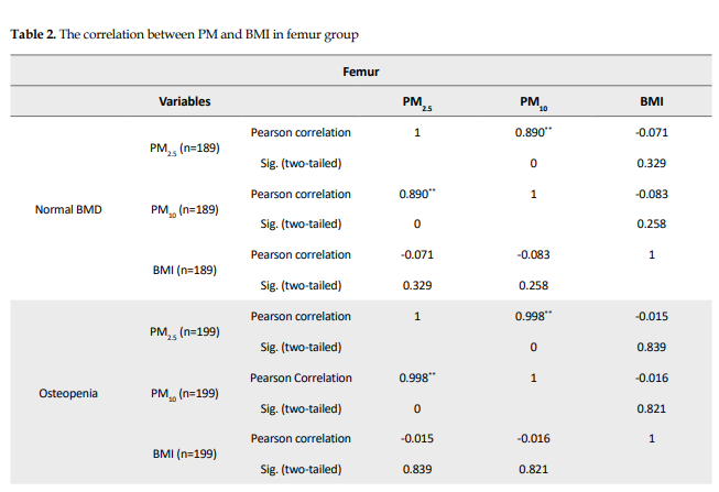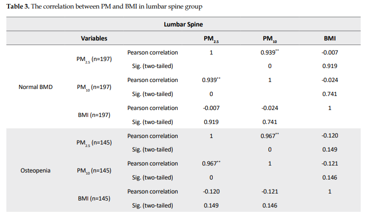 Table 3 presents the Pearson correlation between PM10, PM2.5, and BMI in all three groups (osteopenia, osteoporosis, and normal BMD, which were grouped based on lumbar BMD). In these groups, no significant relationship was observed between PM2.5 and BMI (osteopenia [P=0.149], osteoporosis [P=0.452] and normal BMD [P=0.919]). Also, no significant relationship was observed between PM10 and BMI (osteopenia [P=0.146], osteoporosis [P=0.404], and normal BMD [P=0.741]).