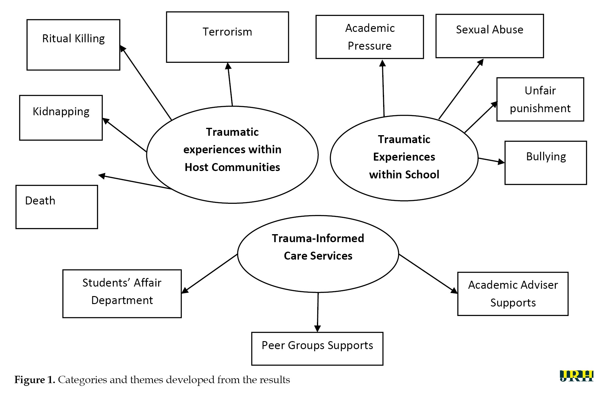 The second category pertains to traumatic experiences within school communities, which include terrorism, kidnappings, ritual killings, and deaths. The final category is access to TIC services, made up of three themes, which include the Students’ Affairs Department, peer group support, and academic adviser support.
