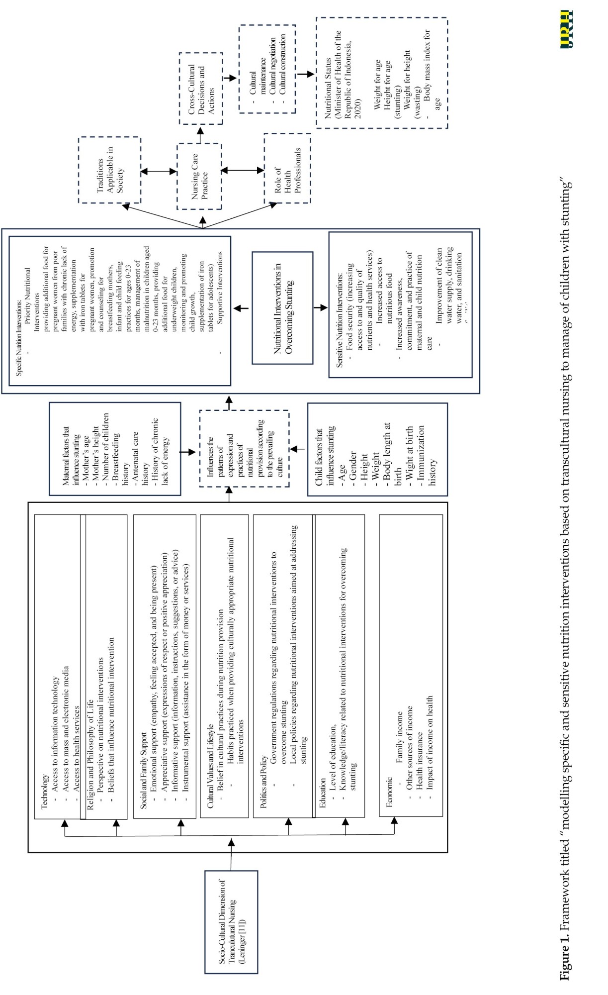 Figure 1 describes the framework titled “modeling specific and sensitive nutrition interventions based on transcultural nursing to address stunting”.