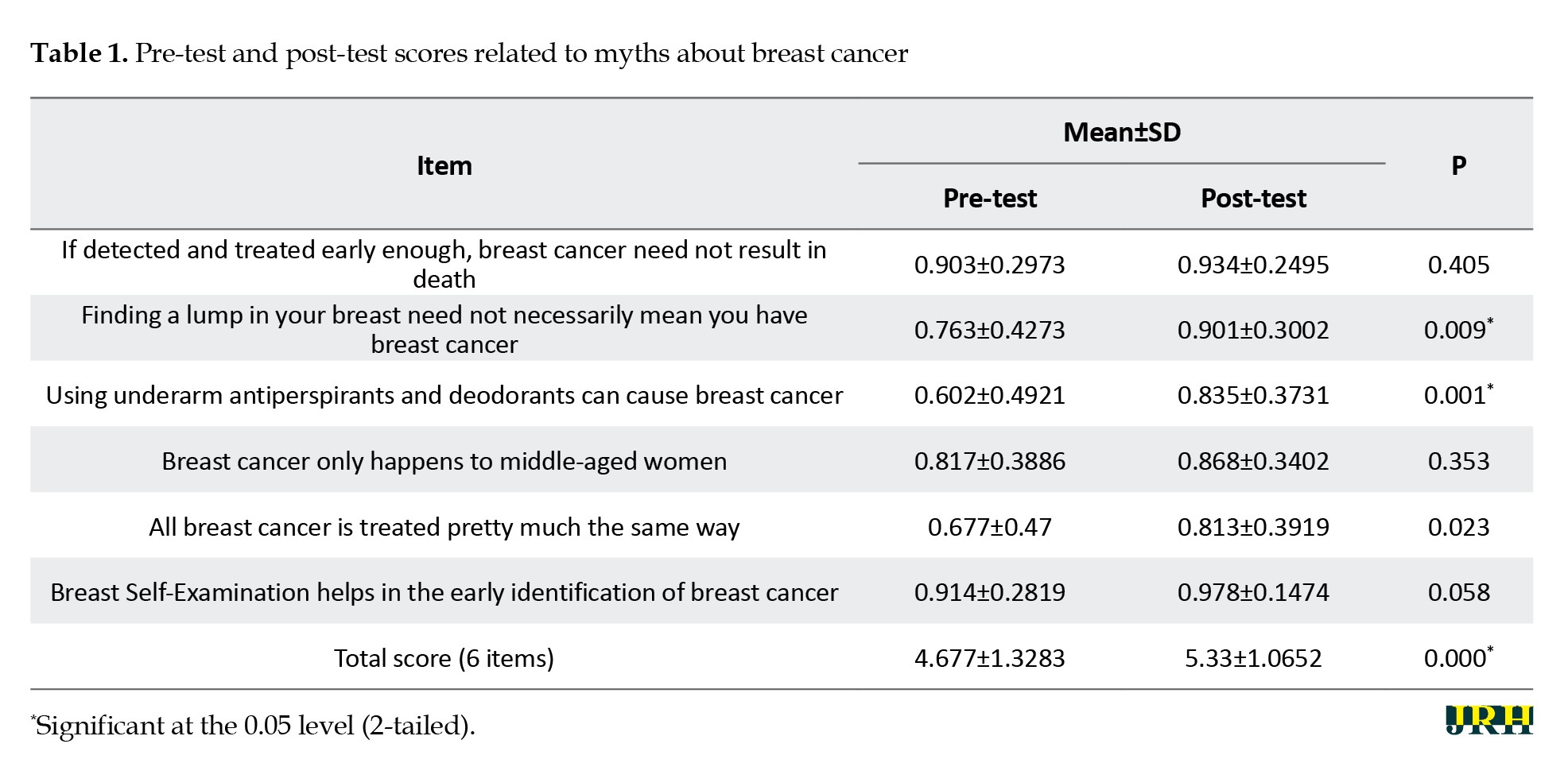 Results of the Wilcoxon signed rank test indicated that there was a significant improvement in the overall perception of participants regarding the facts and myths about breast cancer after the workshop. In addition, pre-existing myths related to the identification of various types of breast lumps and the role of body fragrance products as a risk factor in breast cancer were also effectively rectified.