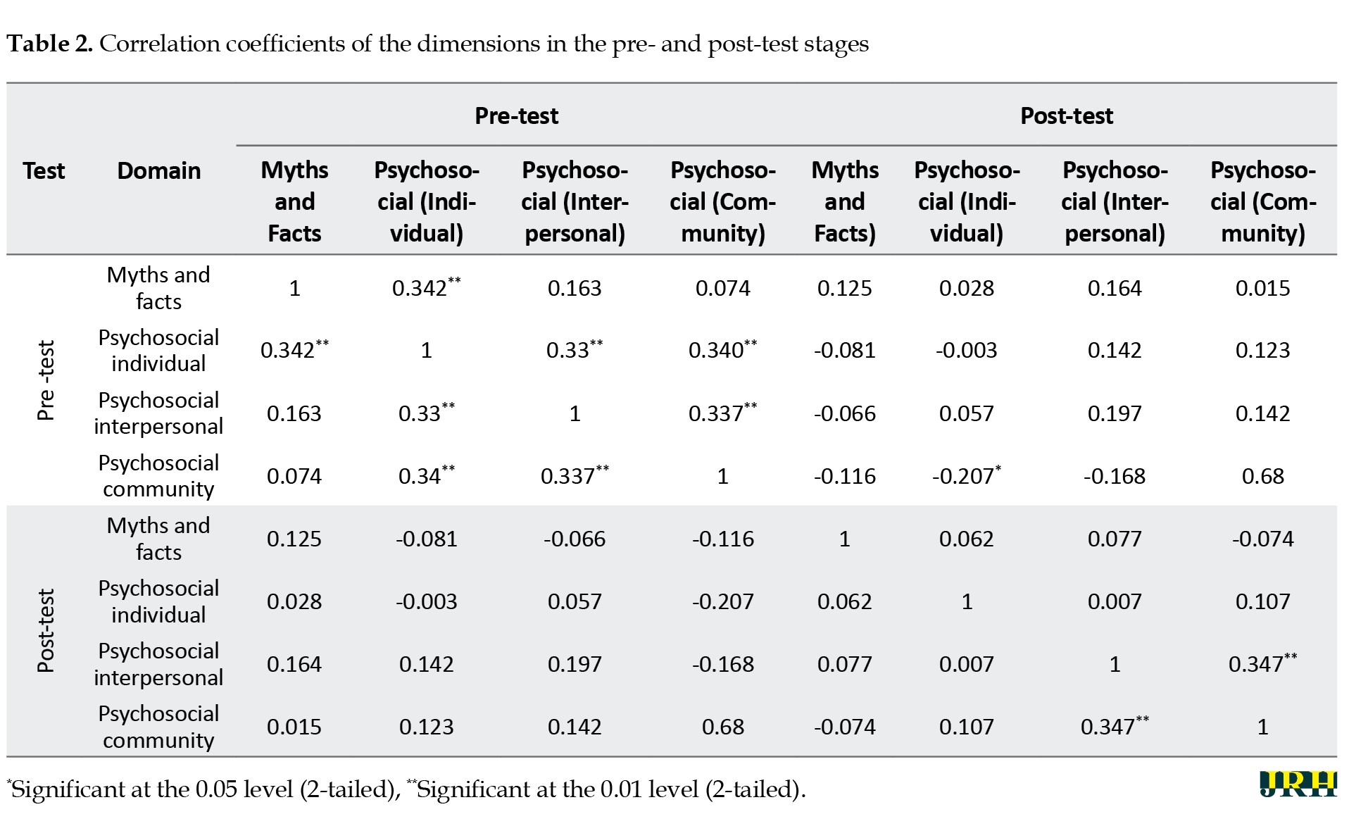 Spearman’s correlation coefficients of both pre-test and post-test stages indicated significant associations among various questionnaire domains, as shown in