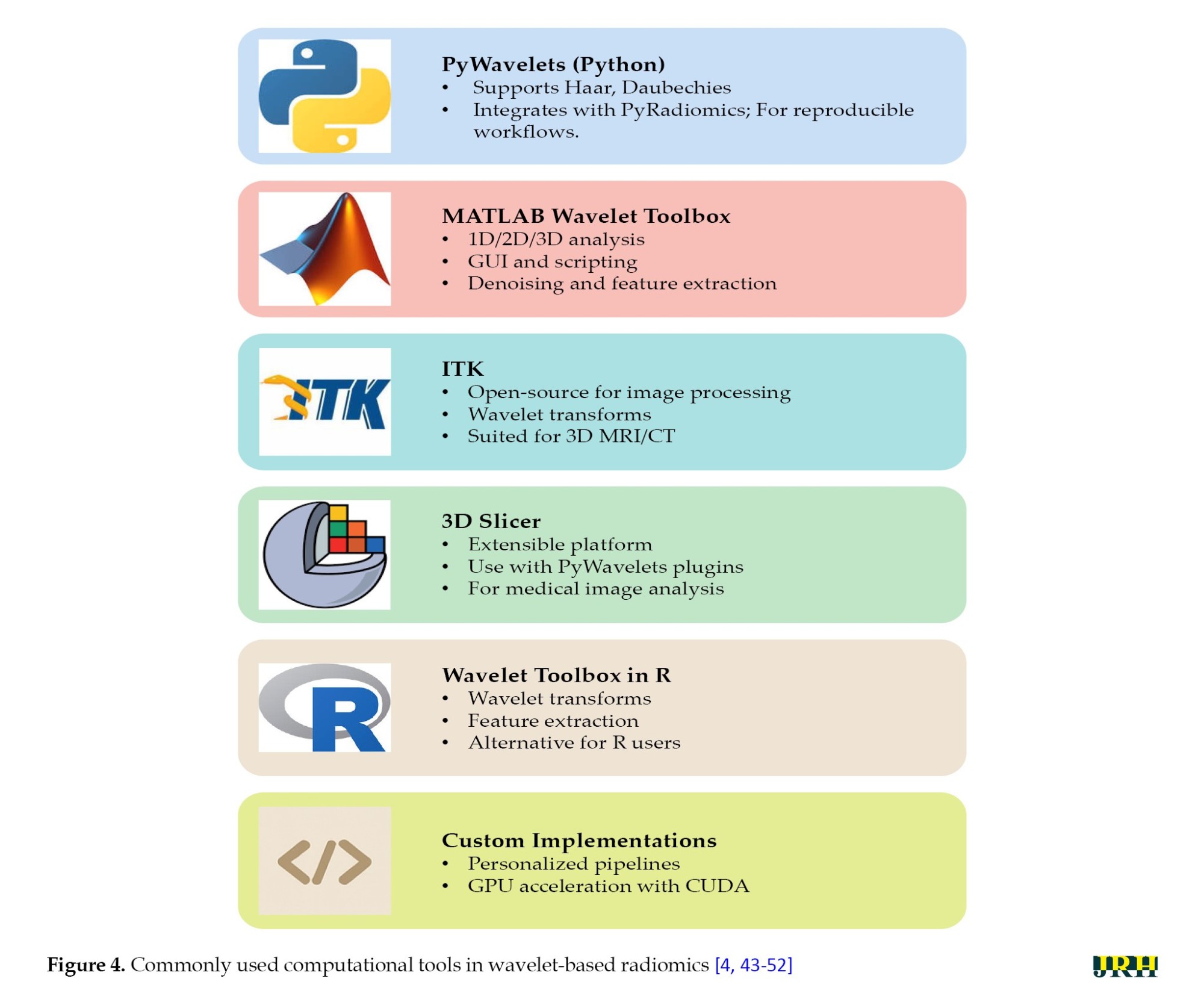 The field of wavelet-based radiomics has benefited significantly from a growing suite of accessible tools and software, which streamline workflows for researchers and clinicians. These platforms facilitate each stage of the radiomics pipeline, from preprocessing and wavelet decomposition to feature extraction and post-processing, thereby broadening access and reducing technical barriers. A brief overview of commonly used tools is shown in
