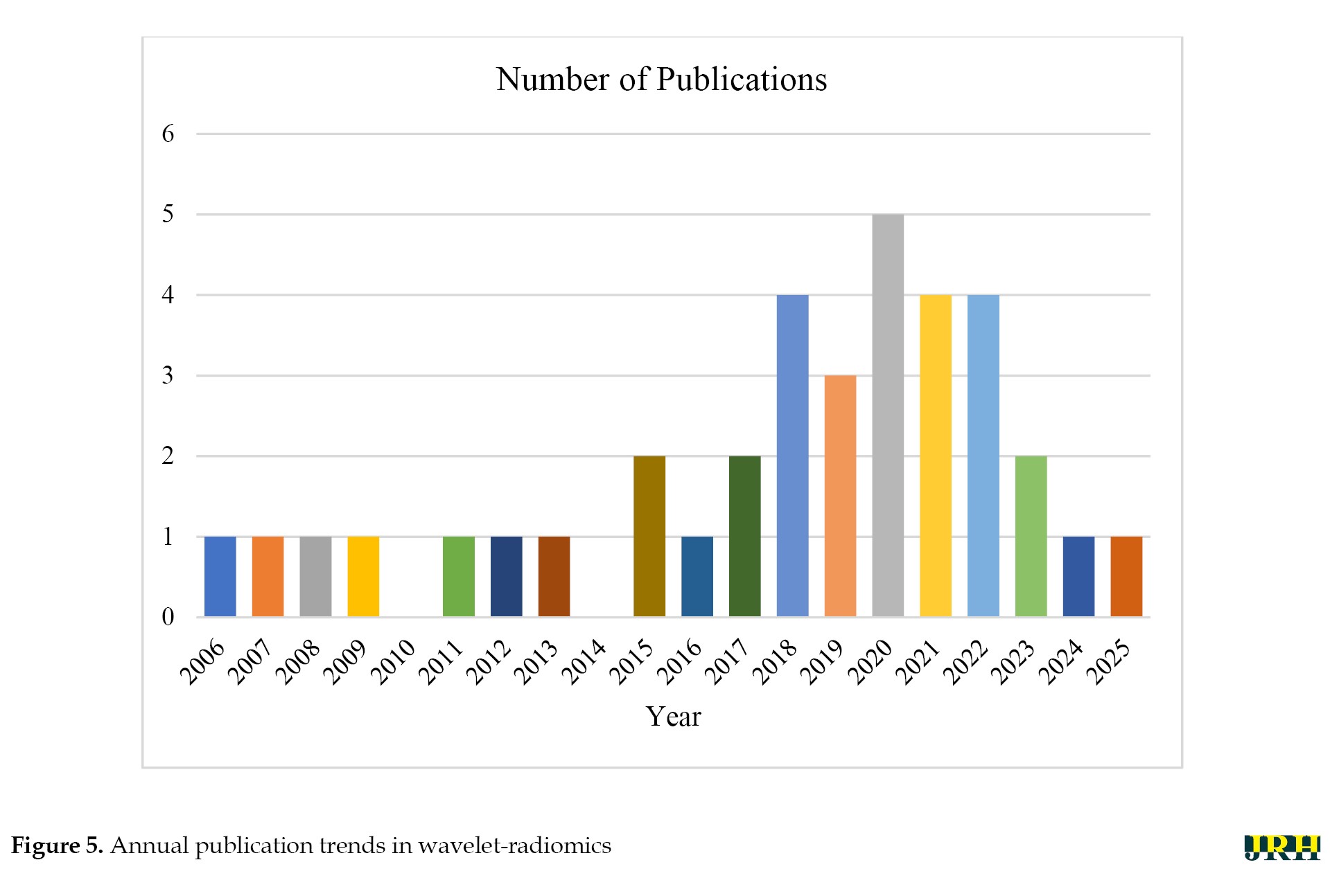 Figure 5 shows publication trends that indicate a steady rise in wavelet-radiomics research, from 1–2 articles annually pre-2015 to a peak of 5 in 2020, reflecting growing interest amid the radiomics boom and the COVID-19-driven demand for robust imaging analytics (e.g. lesion severity grading with AUC 0.910 [19]).
