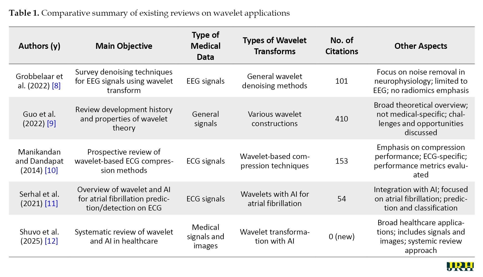 This review stands out from previous literature by providing a specialized and in-depth review of wavelet transforms, with a particular focus on their application in medical images for radiomic feature extraction, a role that has not been extensively covered elsewhere. Grobbelaar et al. concentrate on utilizing wavelet transforms for denoising EEG signals [8], while Guo et al. trace the evolutionary history of wavelet theory and examine its diverse properties in detail [9]. Manikandan and Dandapat investigate wavelet-based techniques for ECG compression, evaluating their effectiveness [10], and Serhal et al. offer a comprehensive review of AI models applied to analyze atrial fibrillation using wavelet transform [11]. In contrast, Shuvo et al. address a broader spectrum, encompassing the analysis of both medical signals and images across various healthcare applications [12]. The innovation of this approach lies in the detailed examination of various wavelet transform transforms—discrete (DWT), continuous (CWT), tunable q-factor wavelet transform (TQWT), and advanced transforms—that are specifically designed for radiomics applications and achieve high performance metrics. Furthermore, the integration of machine learning (ML) and deep learning (DL) with wavelet transform, provides significant insights, making it a valuable resource for advancing radiomics research and clinical practice. As shown in