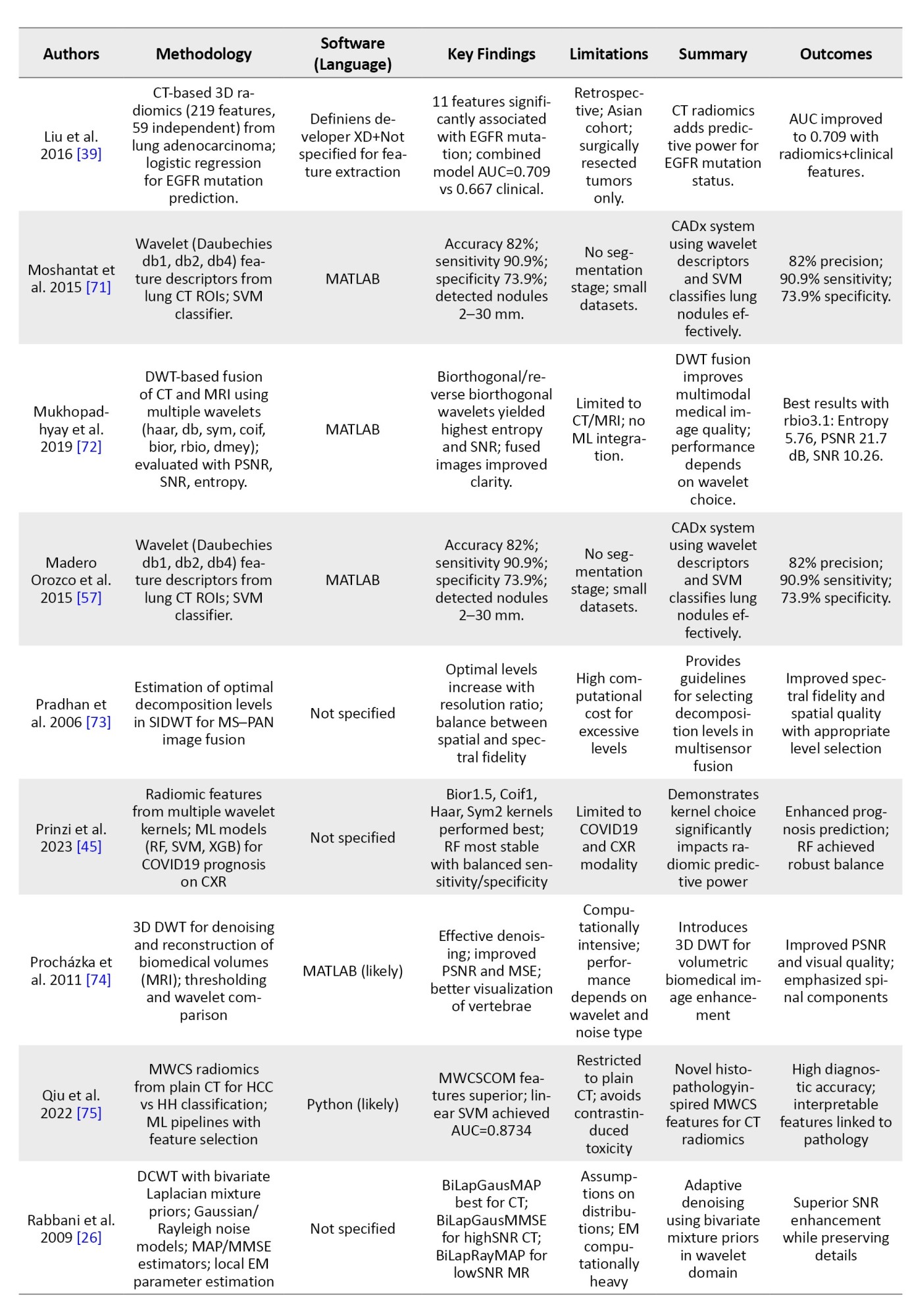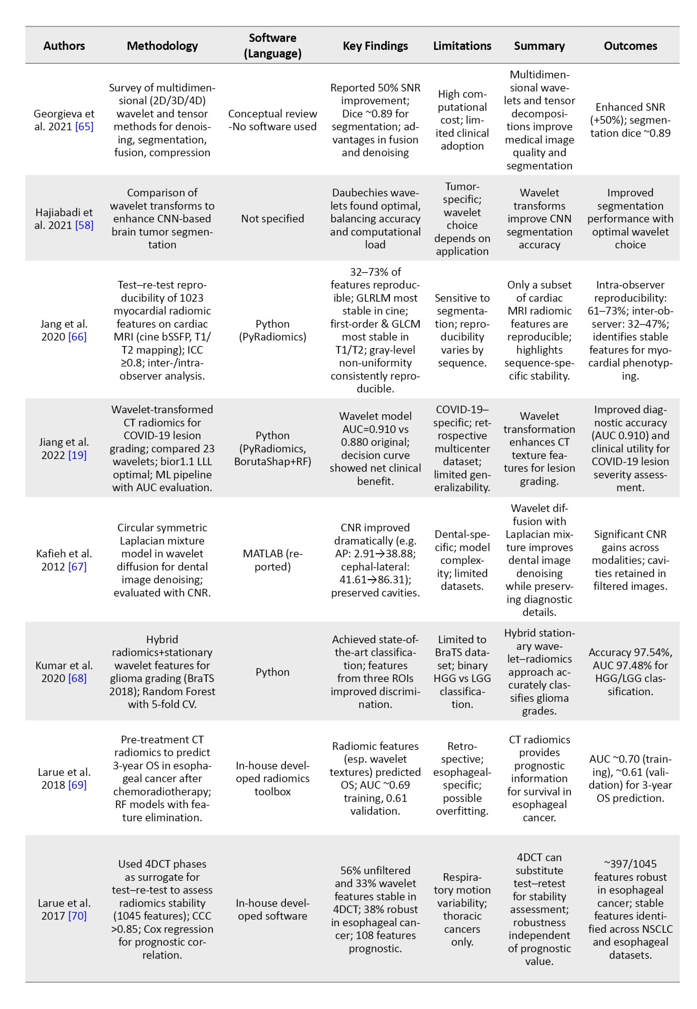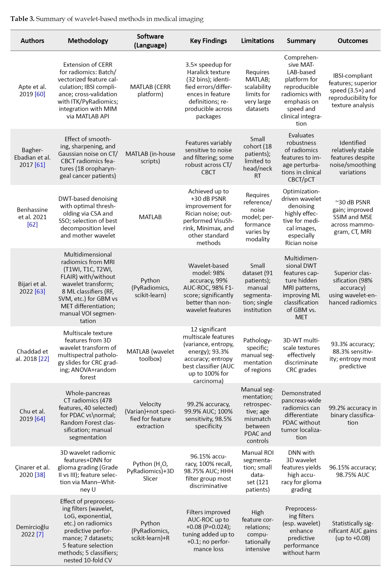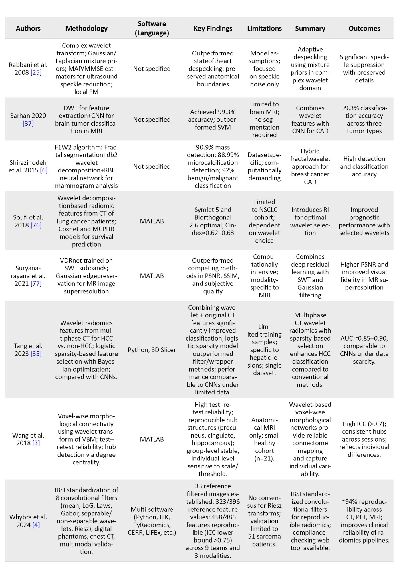 To provide an overview of recent advancements in wavelet-based techniques for medical imaging, we summarized key studies focusing on their methodologies, software tools, findings, and limitations.
