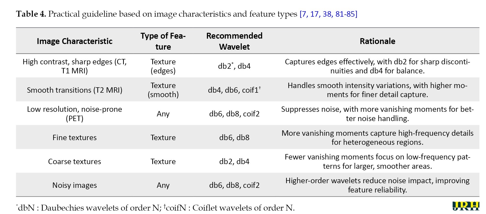 Table 4 provides perspectives pertaining to the choice of wavelet transforms as refracted by image characteristics and the kind of radiomics features, based on ongoing research and practical applications.