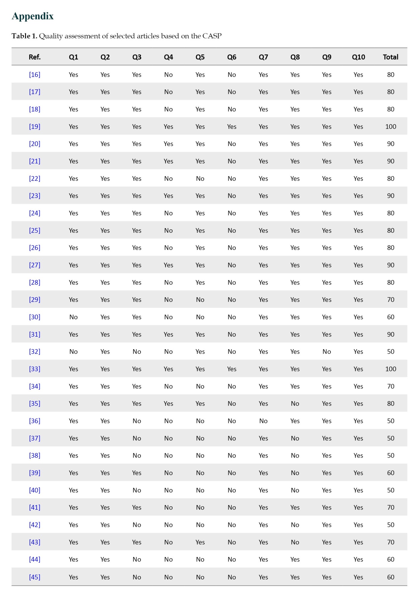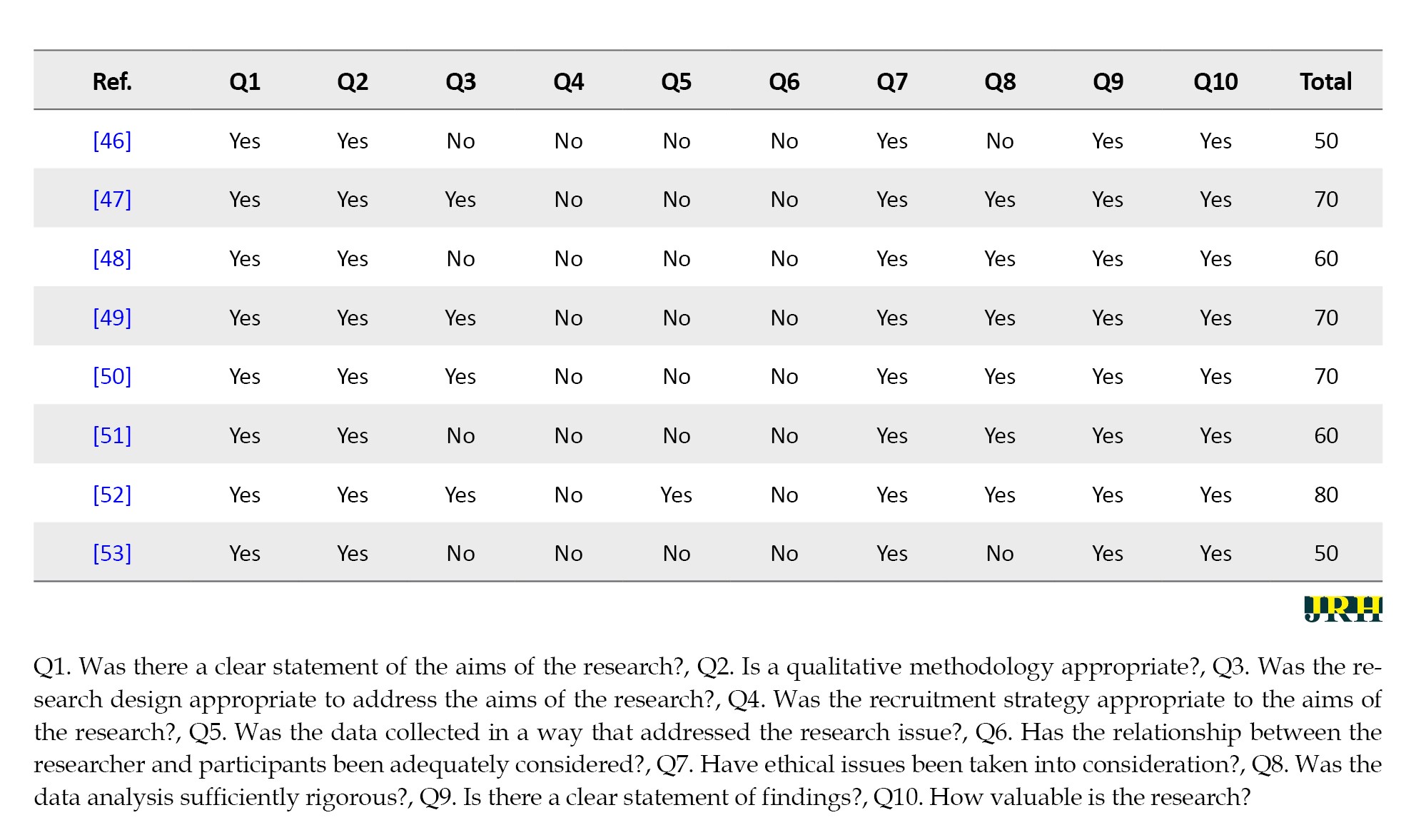 To assess the methodological rigor of included studies, we employed the critical appraisal skills programme (CASP) qualitative checklist [14], which includes ten standard questions evaluating aspects, such as study design, data collection, ethical considerations, and validity of findings. Each question was scored as either “yes”=10, “no”=0, or “can’t tell”=5. thus, the maximum possible score for each study was 100. No differential weighting was applied to individual items. The “Total” score represents the cumulative sum of the ten individual question scores. Studies scoring (below 50) were considered methodologically weak and were excluded from the final thematic synthesis. However, they are reported for transparency and completeness. The quality appraisal was conducted independently by two reviewers (Ahmad Keykha and Jafar Shahrokhi), and disagreements were resolved by discussion or consultation with a third reviewer (Maryam Hojati) (