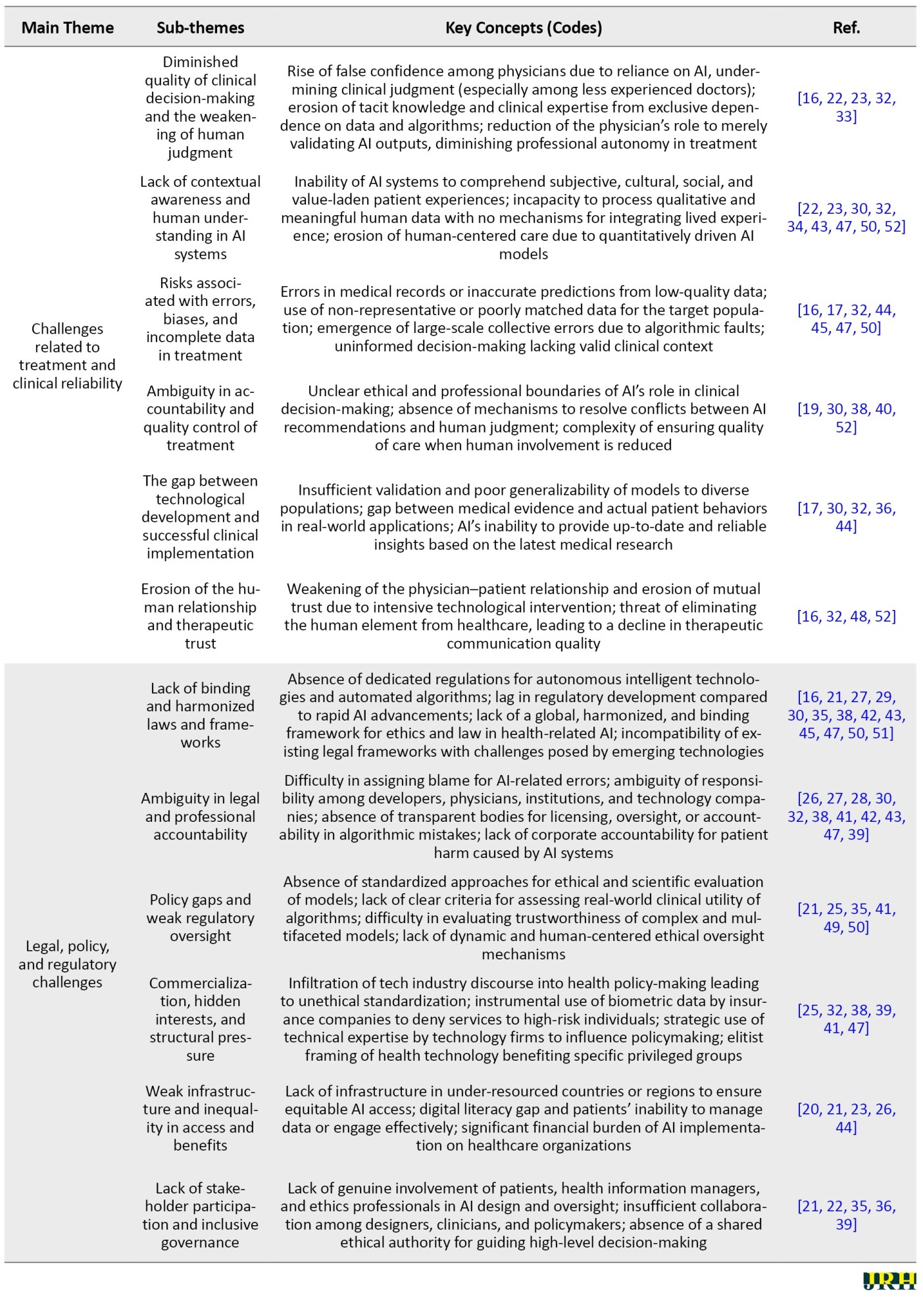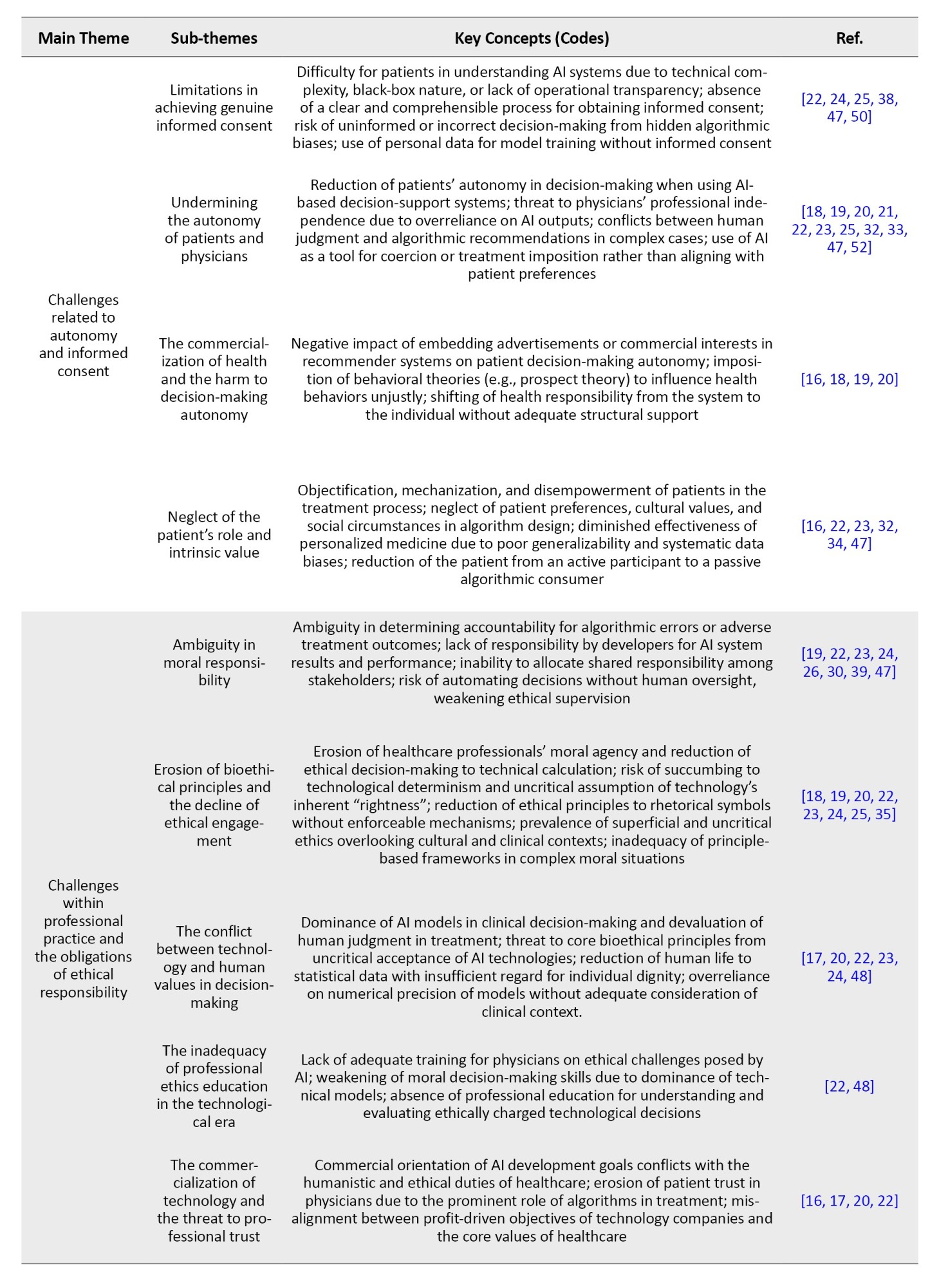 Table 4, which are mostly in the form of narrative reviews, systematic reviews, or scoping reviews and whose primary focus is on compiling, categorizing, and descriptively presenting the findings of previous studies, the present research adopted an analytical–synthetic approach through the use of meta-synthesis and qualitative content analysis. This approach, in addition to collecting secondary data, reconstructed them through a systematic process involving coding, categorization, synthesis, and in-depth interpretation. Accordingly, the present study not only identified the common themes and patterns among previous research but also uncovered the gaps, contradictions, and shortcomings in the literature, ultimately offering an integrated analytical framework for a more comprehensive understanding of the ethical challenges of AI in healthcare. Therefore, while prior reviews mainly address the question of “what findings have been reported,” this meta-synthesis examined “how these findings interrelate, what conceptual connections exist among them, and what new pathways can be outlined for future research and policy-making.”