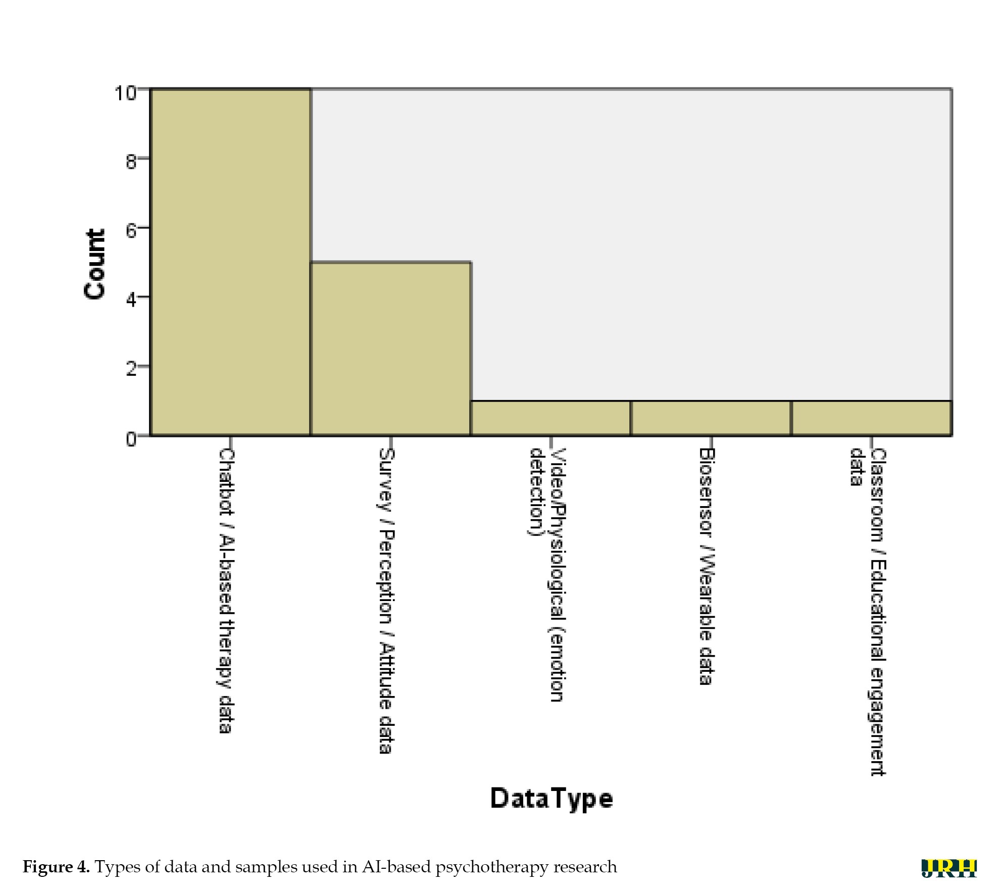 Chatbot- or AI-based therapy data constituted the majority (n=10; 45.5%), reflecting the growing prominence of conversational agents in clinical and subclinical mental health interventions. Survey-, perception-, or attitude-based data were used in five studies (22.7%), primarily to assess user and clinician acceptance, ethical concerns, and perceived utility of AI tools. One study (4.5%) employed multimodal video and physiological data to detect emotional states through advanced computational models, while one study (4.5%) utilized wearable biosensor data for predictive modeling in obsessive-compulsive disorder. Additionally, one study (4.5%) analyzed classroom and educational engagement data, demonstrating the versatility of AI applications beyond traditional psychotherapy contexts.