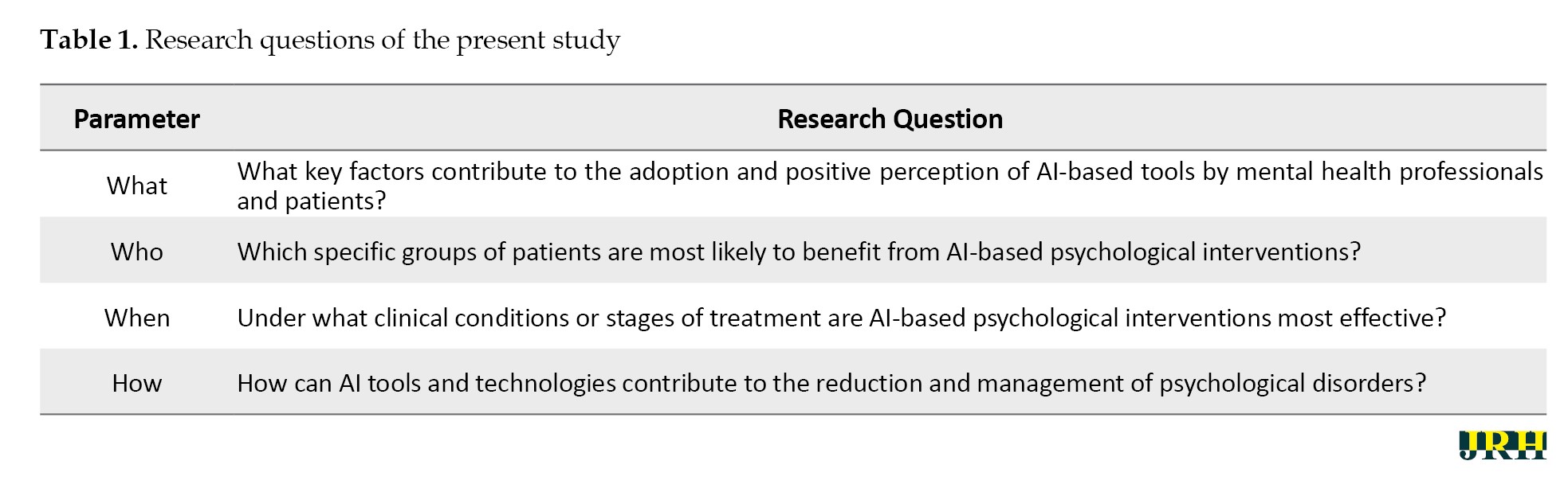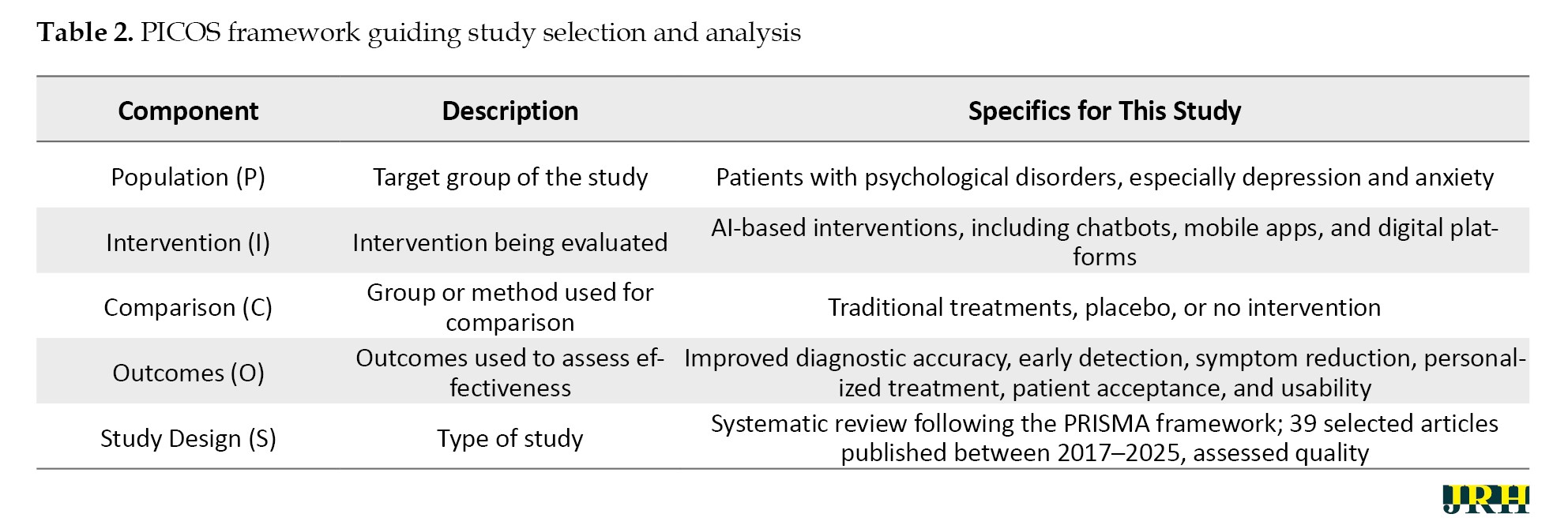 The present study is a systematic review conducted following the PRISMA [28] framework, aiming to investigate existing research on the effectiveness of AI interventions in the treatment of psychological disorders. The research was guided by a structured set of questions addressing key dimensions, such as purpose, target population, timing, and mechanisms of AI-based psychological interventions (