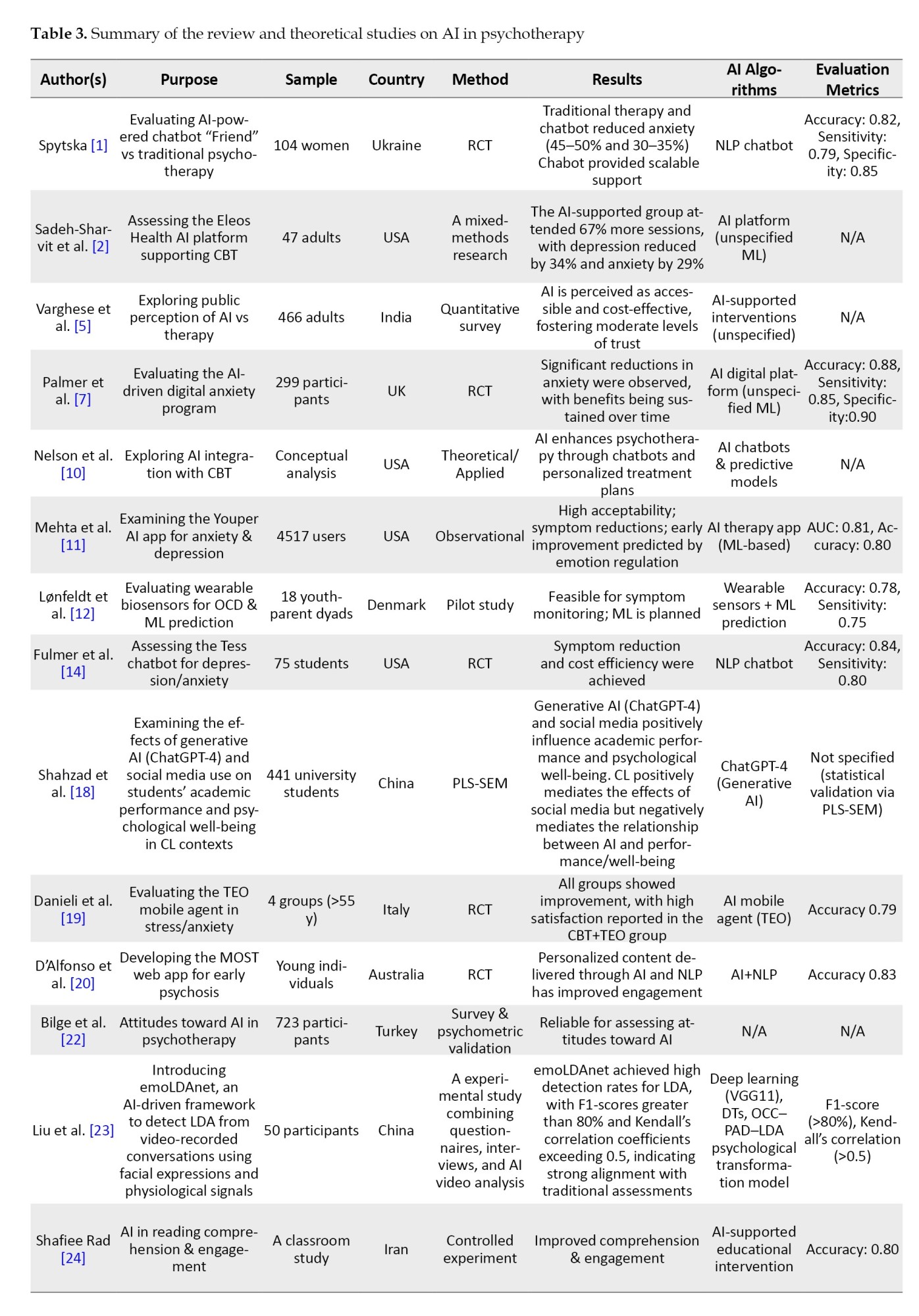 Table 3 encompasses empirical and data-driven studies that provide measurable evidence of AI’s efficacy in clinical and therapeutic contexts, employing RCTs, observational designs, and psychometric validations to evaluate performance indicators, such as accuracy, sensitivity, and treatment outcomes. In contrast,