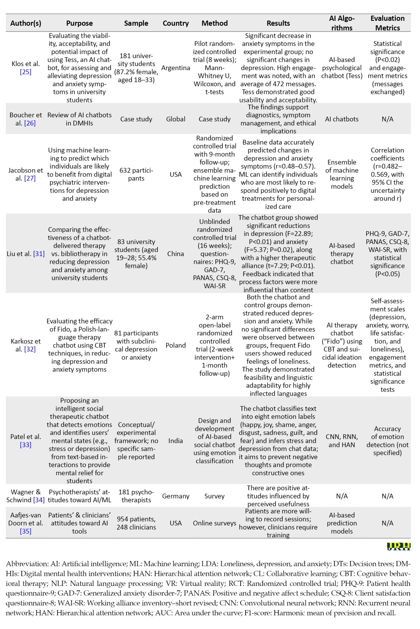 - Lau Y, Ang WH, Ang WW, Pang PC, Wong SH, Chan KS. Artificial Intelligence-Based Psychotherapeutic Intervention on Psychological Outcomes: A Meta‐Analysis and Meta‐Regression. Depression and Anxiety. 2025; 2025(1):8930012. [DOI:10.1155/da/8930012]