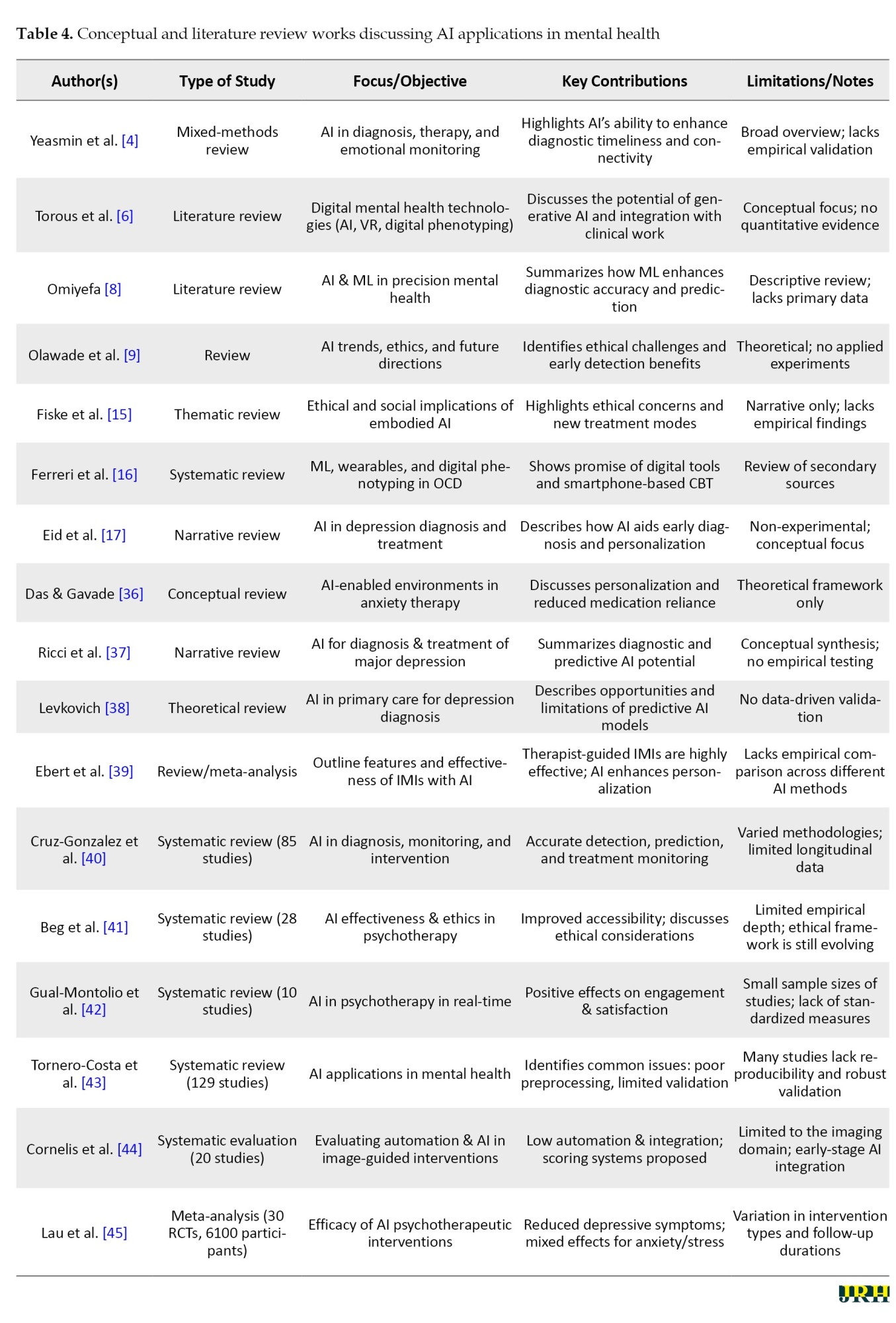 - Tornero-Costa R, Martinez-Millana A, Azzopardi-Muscat N, Lazeri L, Traver V, Novillo-Ortiz D. Methodological and quality flaws in the use of artificial intelligence in mental health research: systematic review. JMIR Mental Health. 2023; 10(1):e42045. [DOI:10.2196/42045] [PMID]
