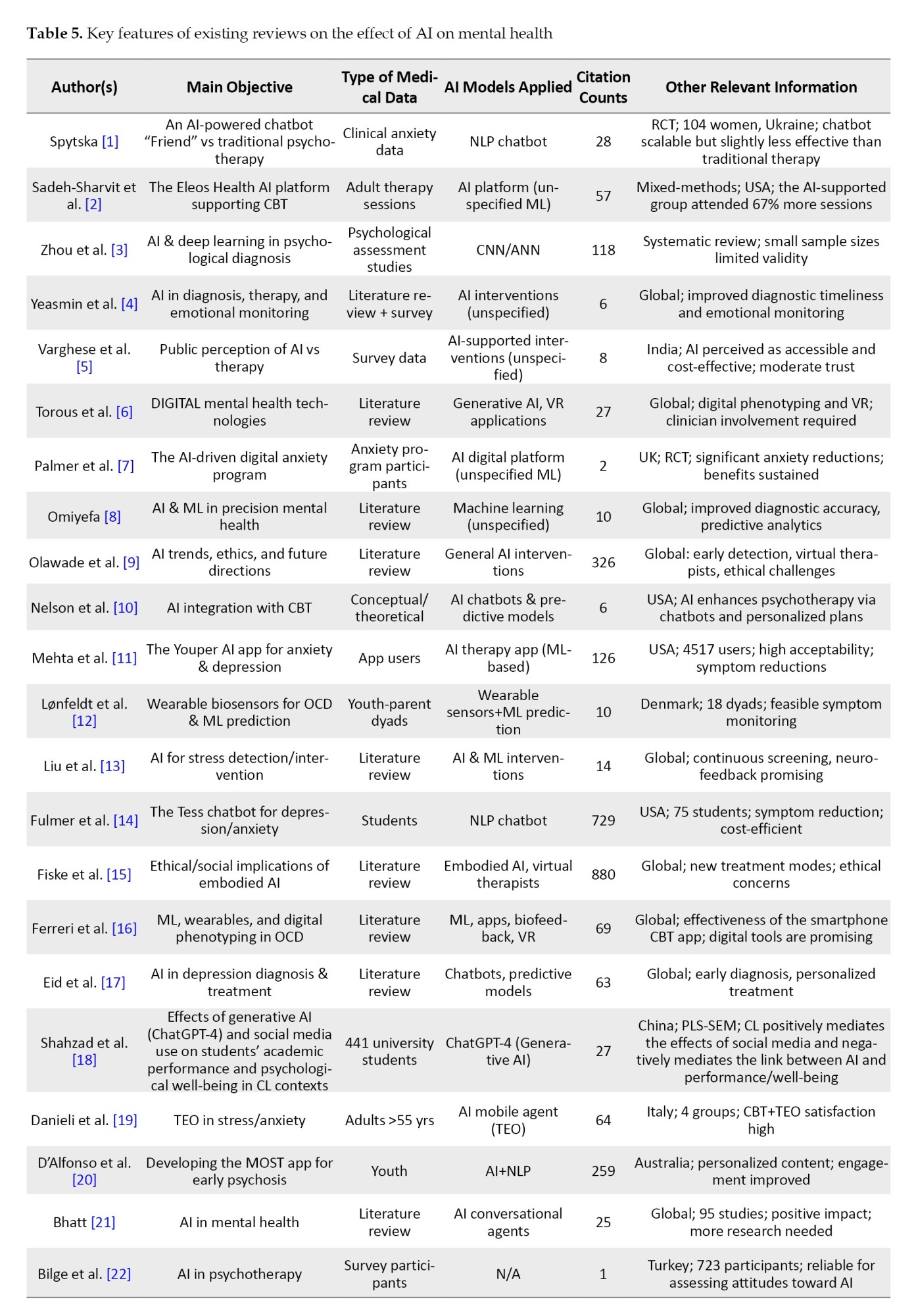 - Gual-Montolio P, Jaén I, Martínez-Borba V, Castilla D, Suso-Ribera C. Using artificial intelligence to enhance ongoing psychological interventions for emotional problems in real or close to real-time: A systematic review. International Journal of Environmental Research and Public Health. 2022; 19(13):7737. [DOI:10.3390/ijerph19137737] [PMID]