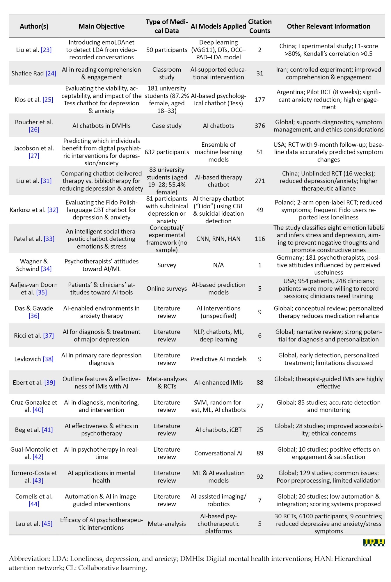 - Cruz-Gonzalez P, He AW, Lam EP, Ng IM, Li MW, Hou R, et al. Artificial intelligence in mental health care: a systematic review of diagnosis, monitoring, and intervention applications. Psychological Medicine. 2025; 55:e18. [DOI:10.1017/S0033291724003295] [PMID]