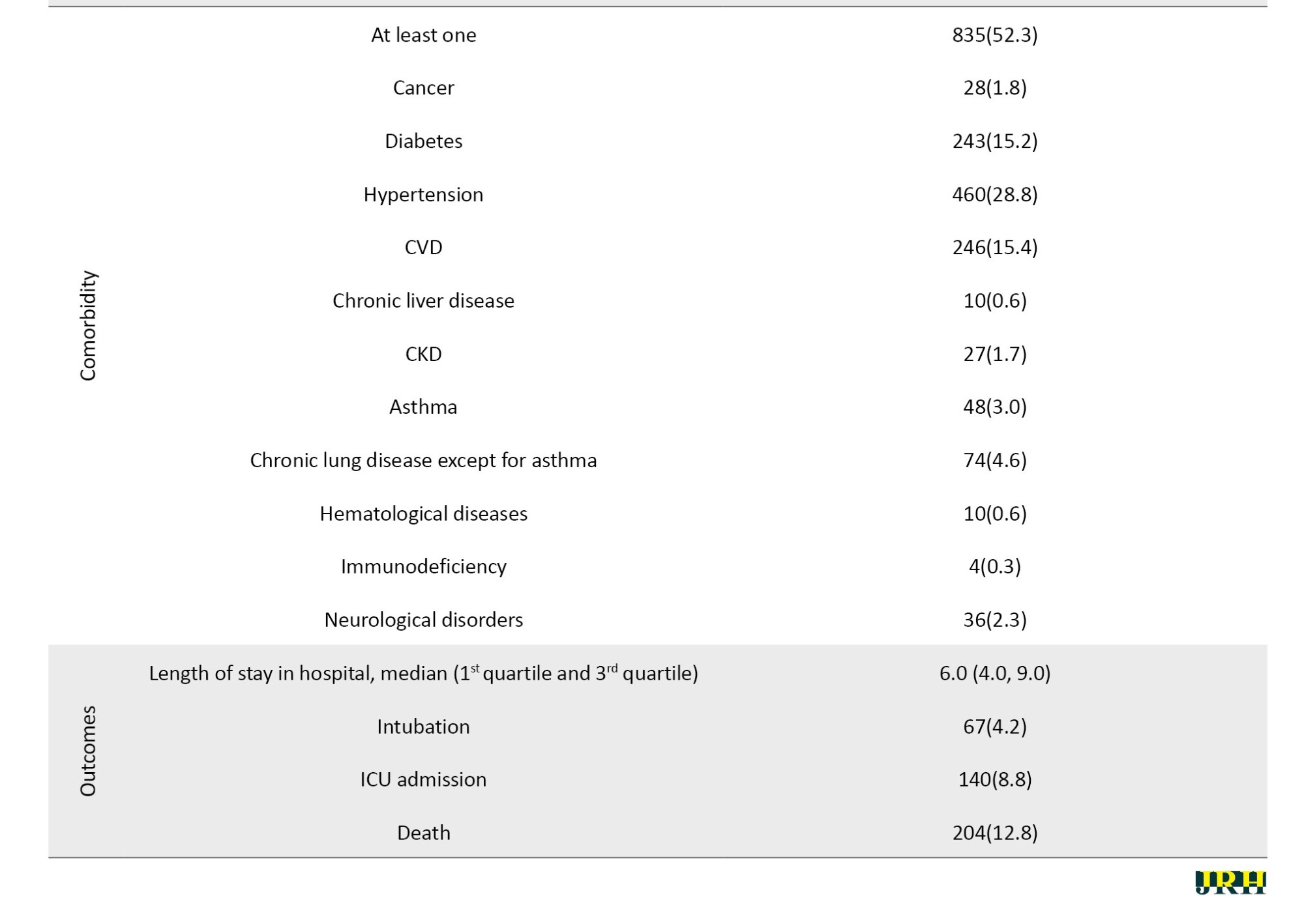 The study included a total of 1596 COVID-19 patients (with a confirmed diagnosis of coronavirus infection via RT-PCR method) admitted to Bohlool Hospital. The median age of the patients was 61.0 years, with a range from 44.0 to 76.0 years. Among the study participants, 48.4% were male. Additionally, 26.0% had a history of COVID-19, 2.4% had a smoking history, and 4.8% had a history of opium use. Regarding the clinical features, the most common symptoms and signs reported by the patients were respiratory distress (57.1%), fever (37.3%), and cough (32.5%). In terms of comorbidities, 52.3% of the patients had at least one underlying condition. The most prevalent comorbidities among COVID-19 patients were hypertension (28.8%), CVD (15.4%), and diabetes (15.2%). Other comorbidities included CKD (10.4%), asthma (5.1%), and cancer (1.8%). The study also investigated the outcomes of COVID-19 patients. The median length of hospital stay was 6.0 (Interquartile range: 5.0) days. Intubation was required for 4.2% of the patients, while 8.8% were admitted to the intensive care unit. The overall mortality rate among the patients was 12.8% (Table 1).