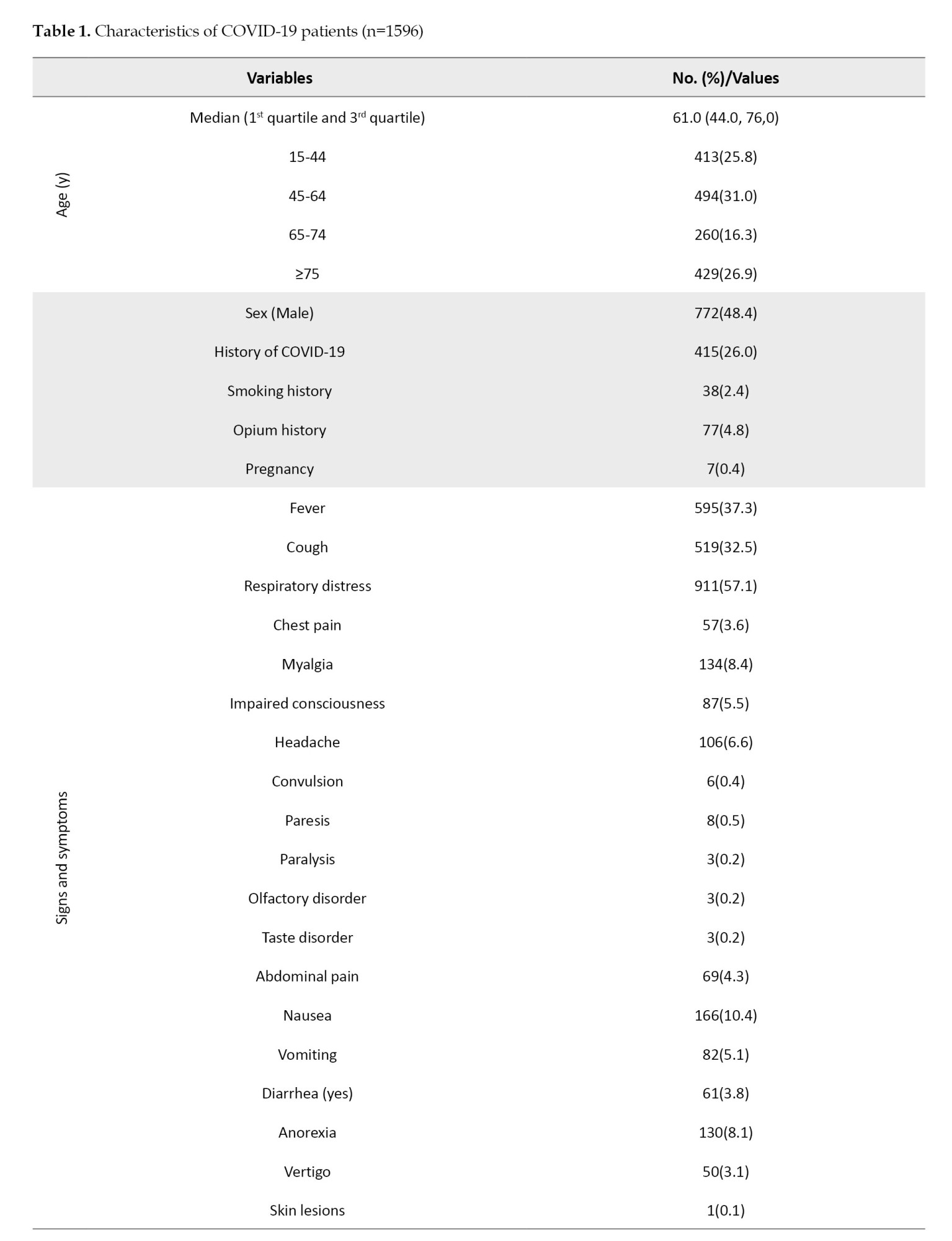 The study included a total of 1596 COVID-19 patients (with a confirmed diagnosis of coronavirus infection via RT-PCR method) admitted to Bohlool Hospital in Gonabad, Razavi-Khorasan province, Iran, from February 19, 2020 to November 17, 2021.