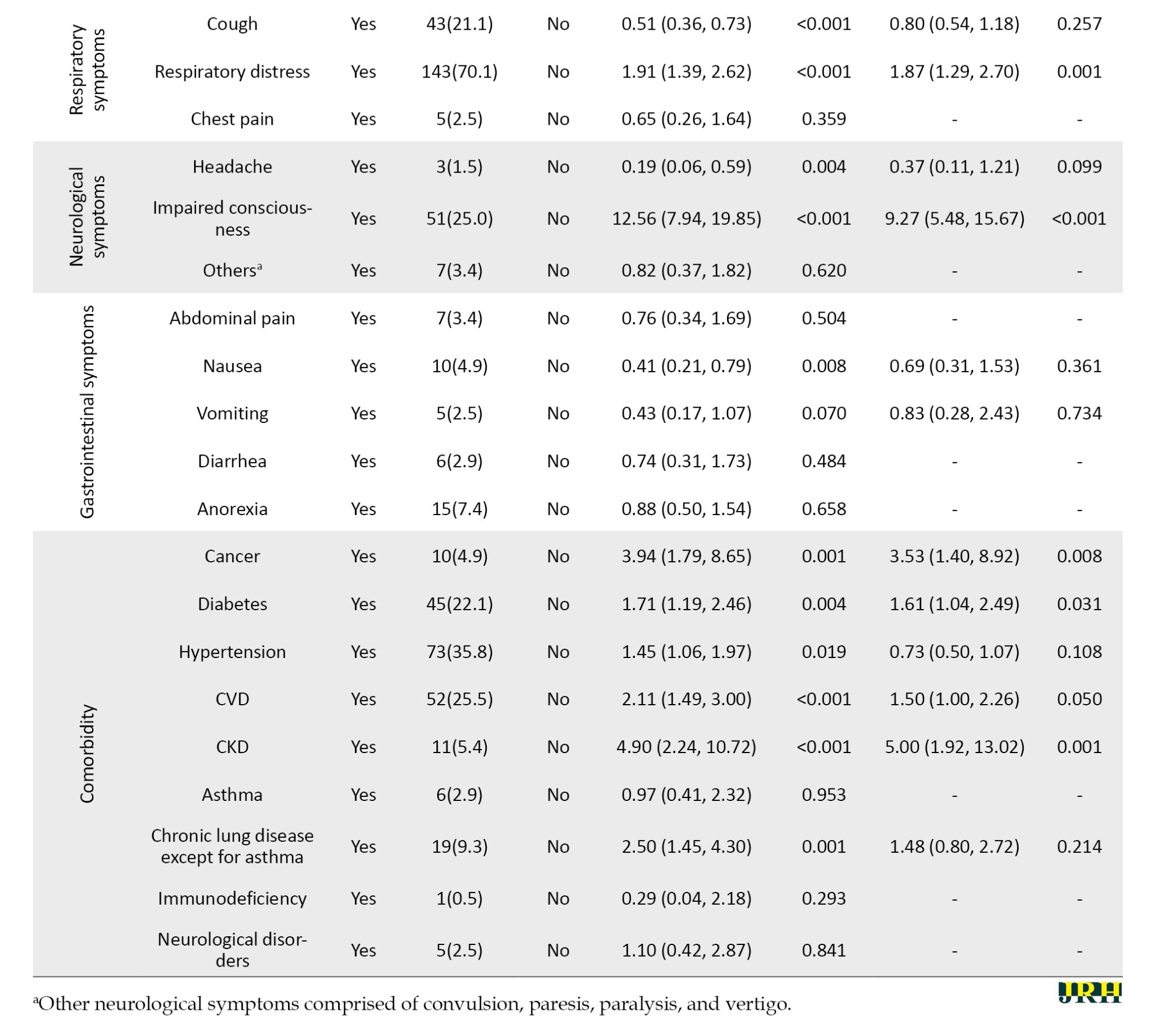 The following demographic and clinical data were collected: Age, sex, history of COVID-19, smoking history, opium history, pregnancy, presenting symptoms and signs (fever, cough, respiratory distress, chest pain, myalgia, impaired consciousness, headache, convulsion, paresis, paralysis, olfactory disorder, taste disorder, abdominal pain, nausea, vomiting, diarrhea, anorexia, vertigo, and skin lesions), baseline comorbidity (cancer, diabetes, hypertension, cardiovascular disease (CVD), chronic liver disease, chronic kidney disease (CKD), asthma, chronic lung disease except for asthma, hematological diseases, immunodeficiency, and neurological disorders), and hospitalization outcomes (length of stay in hospital, intubation, ICU admission, and death).