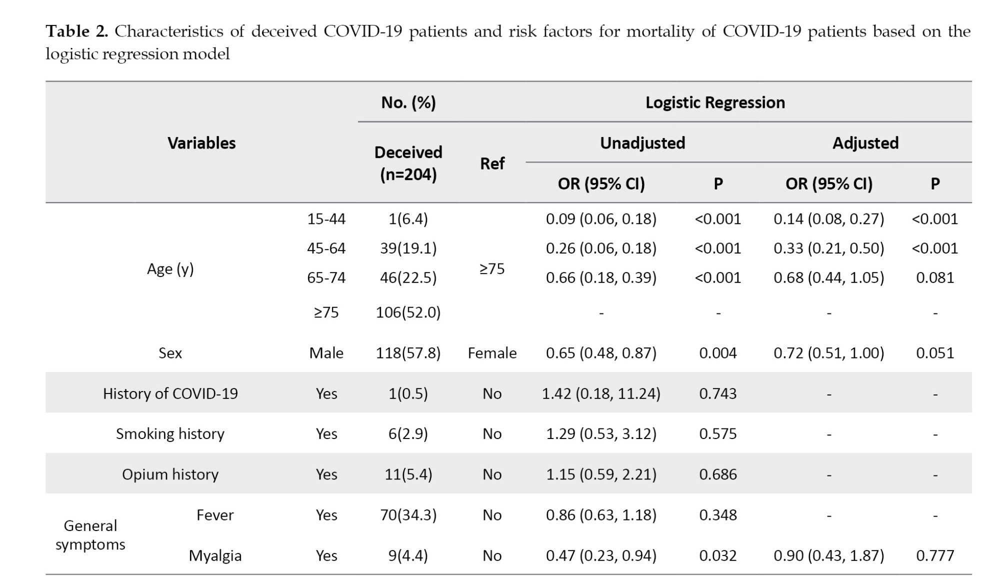 Table 2 provides information on the characteristics of COVID-19 patients who died. The majority of them were 65 years or older, comprising 74.5% of the sample. Also, 57.8% were male. Only 0.5% had a history of COVID-19. A small percentage of patients (2.9% and 5.4%, respectively) reported a history of smoking or opium use. The most common symptoms and signs among died patients were respiratory distress (70.1%), followed by fever (34.3%), impaired consciousness (25.0%), and cough (21.1%). The most prevalent comorbidities were hypertension (35.8%), CVD (25.5%), and diabetes (22.1%).