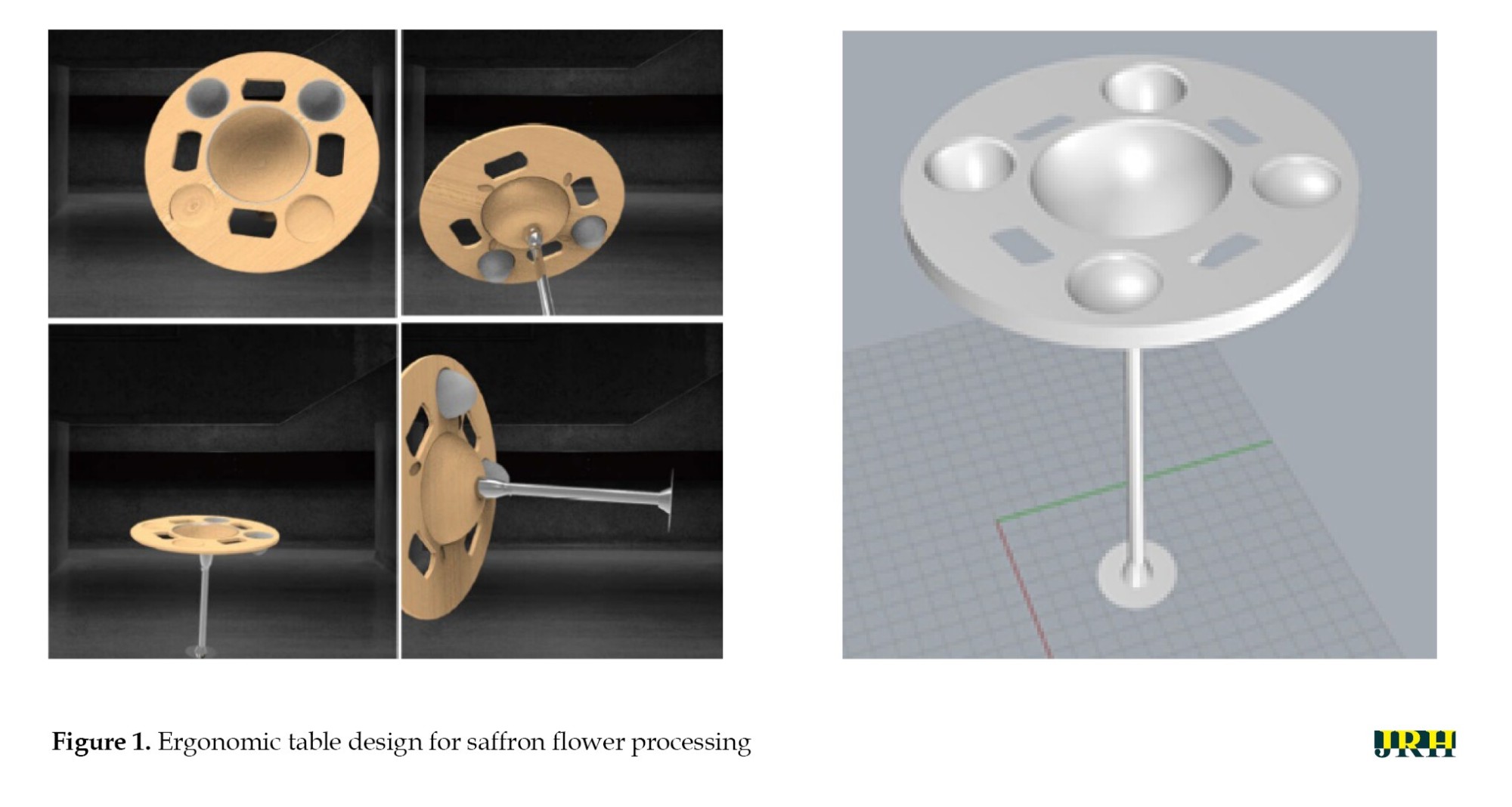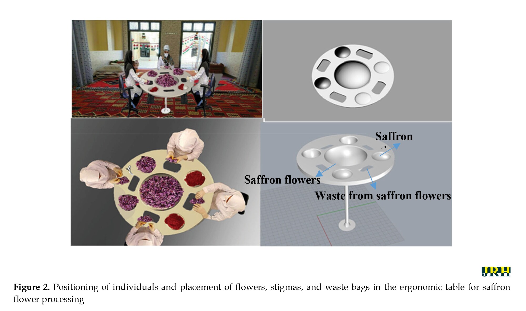 It should be noted that 86 thousand hectares out of the total of 105 thousand hectares of saffron cultivation land in Iran belong to Razavi Khorasan, among which Gonabad with 3 thousand and 500 hectares of saffron farm produces 12 tons of crops annually and half of the cultivated land in this city is devoted to saffron. The primary objective of this study was to design an ergonomic table specifically for processing saffron flowers, utilizing anthropometric data from the local user population.