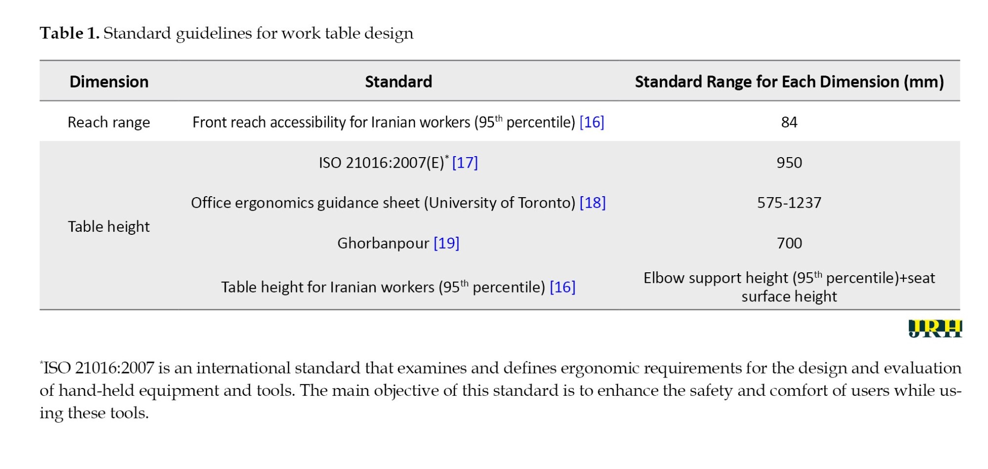 In this stage, the sizes of the anthropometric dimensions necessary for table design, which were extracted in the previous step, were determined. Considering that the anthropometric data of workers aged 20 to 60 years were collected and published by the Environmental Health and occupational health office of the ministry of health, these data were used for table design (Table 1). These data were used for the design of the table and are applicable to the Iranian population.